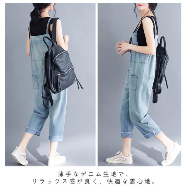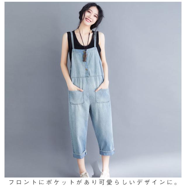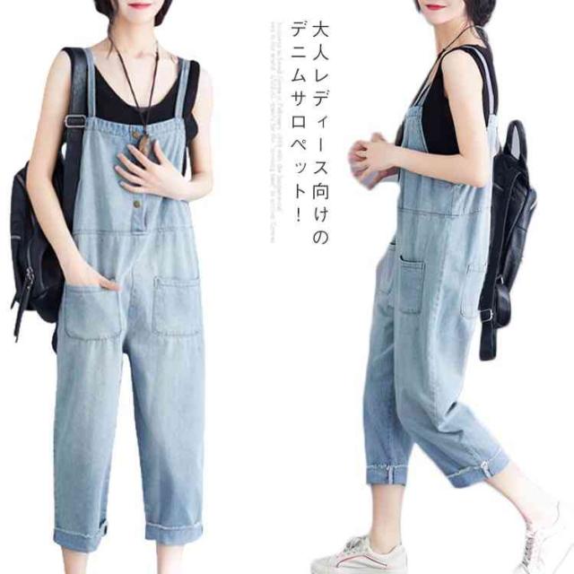 サロペット デニムパンツ レディース ロングパンツ 9分丈 オーバーオール ゆったり ワイドパンツ ロールアップ 薄手 大人カジュアル 可愛い