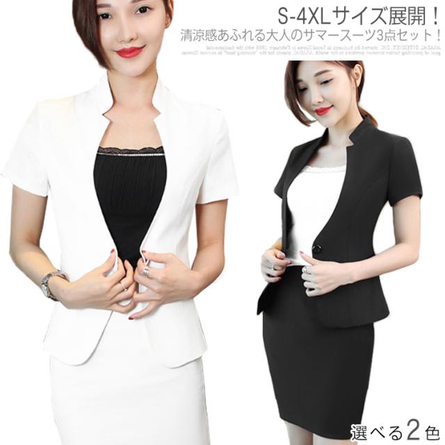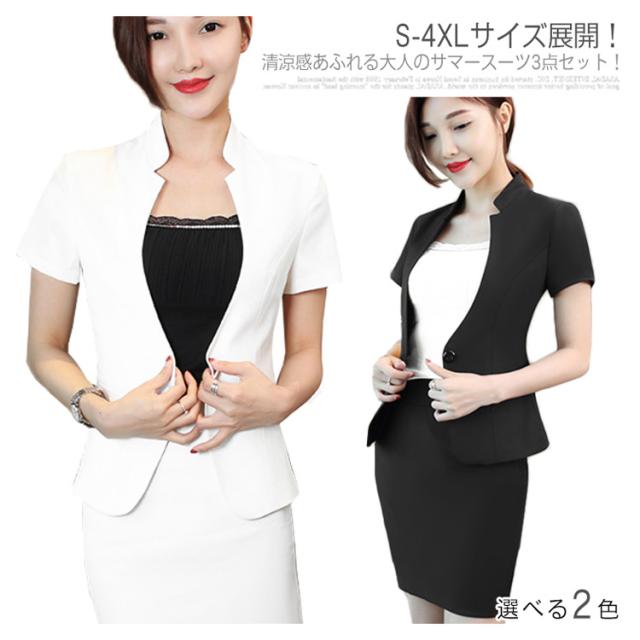 S-4XLサイズ!スカートスーツ 夏用 スーツ 半袖 フォーマルスーツ 3点セット セレモニースーツ 入学式 入園式 卒業式 卒園式 同窓会 事務服 ビジネス OL 通勤 ブラック ホワイト 白送料無料