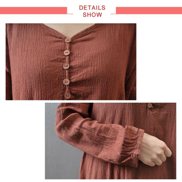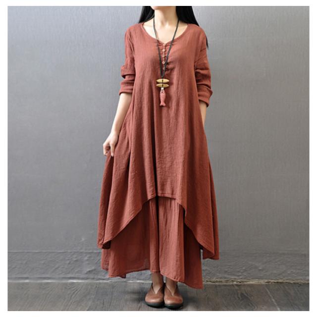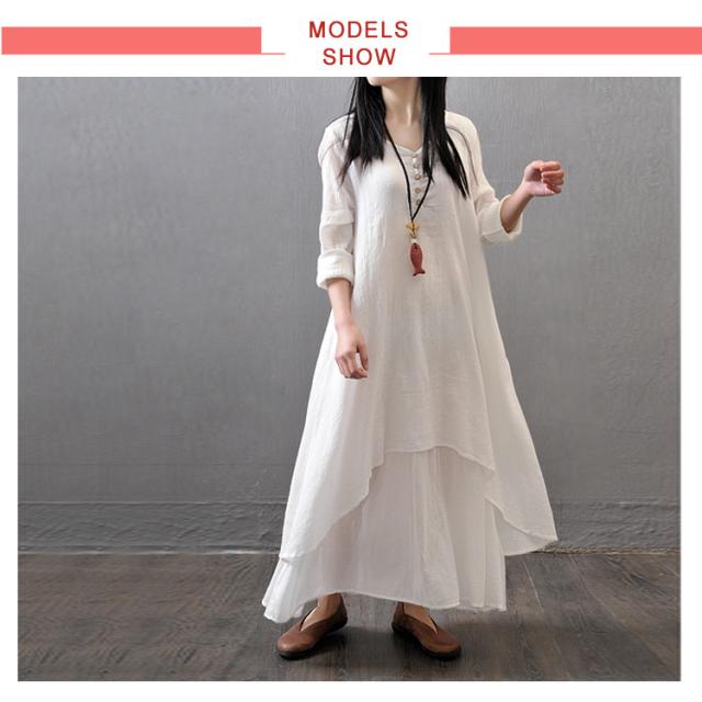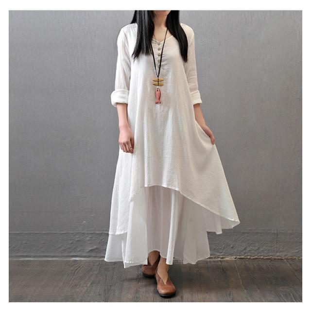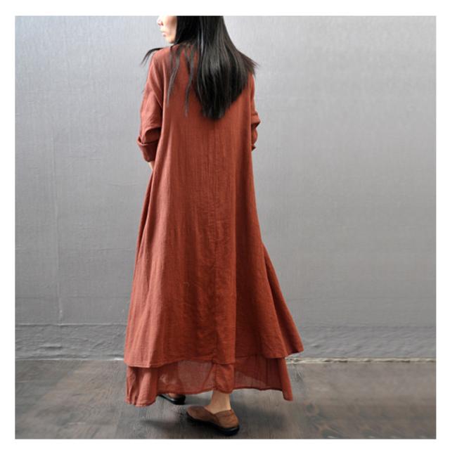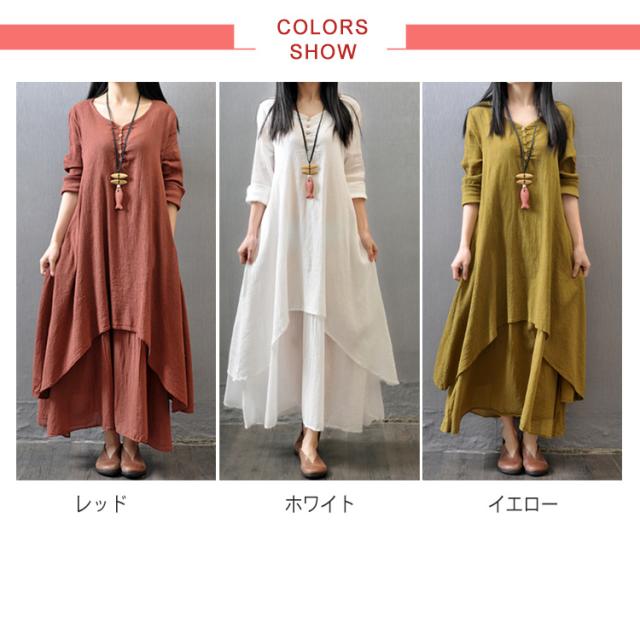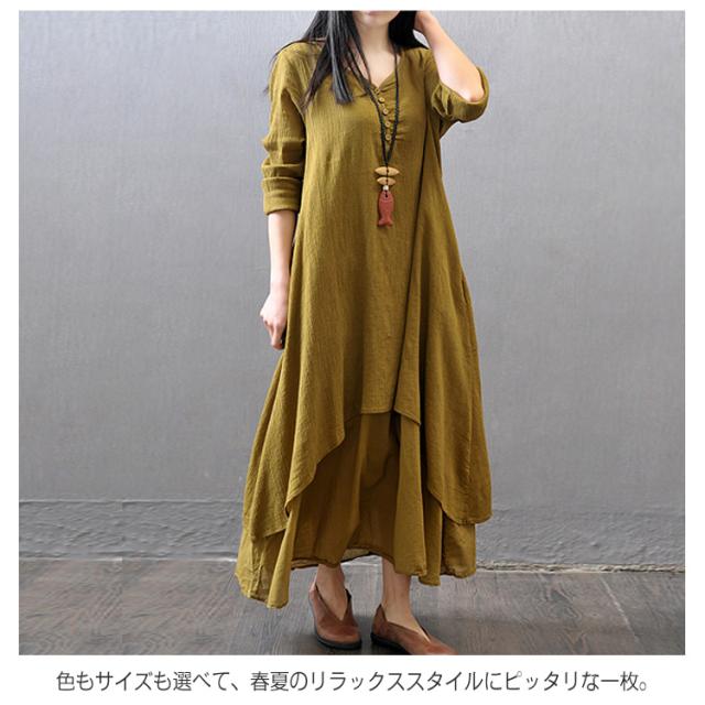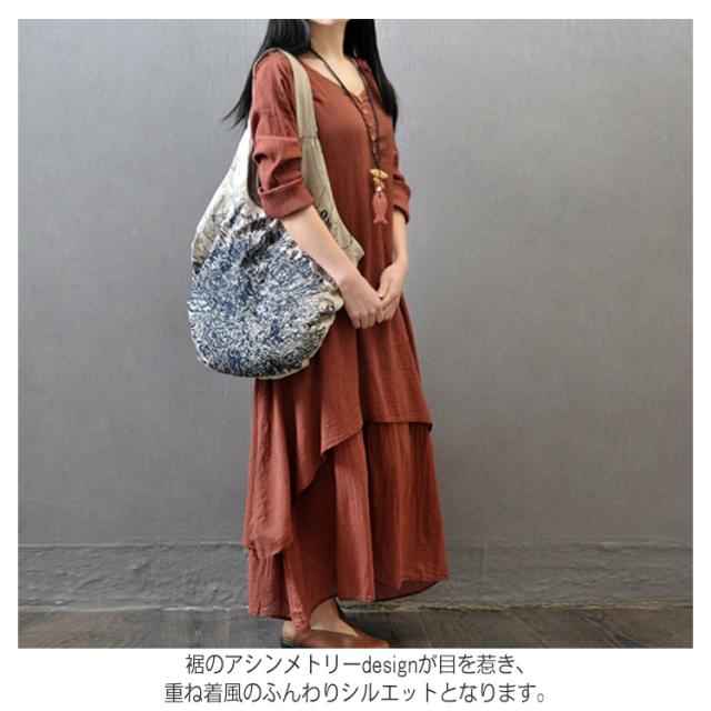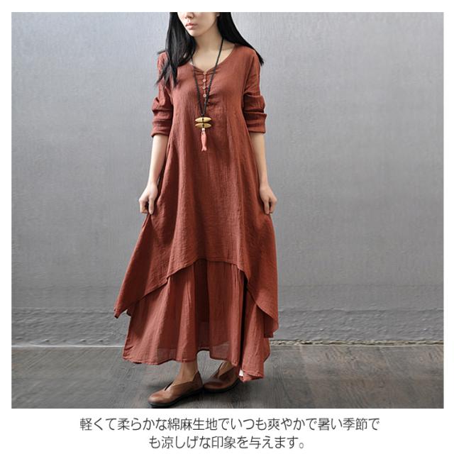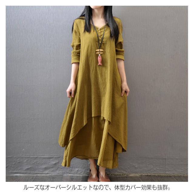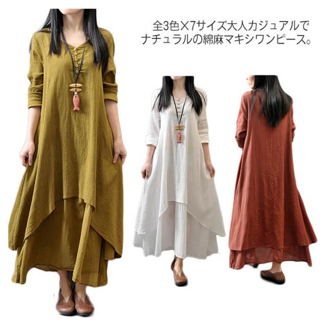 《》全3色×7サイズ!ヘンリーネック マキシワンピース ロングワンピース 長袖 ワンピース ロング丈 マキシ丈 Vネック 重ね着風 変形裾 Aライン 大人カジュアル ナチュラル 綿 麻 リネン送料無料