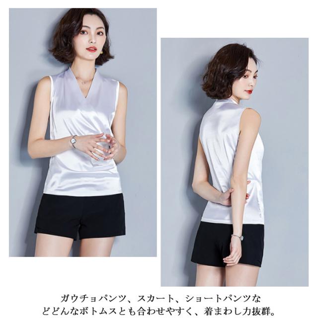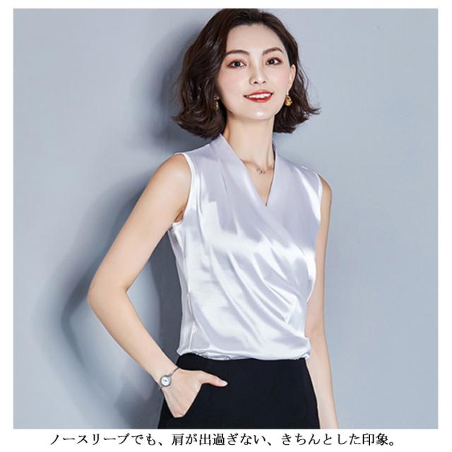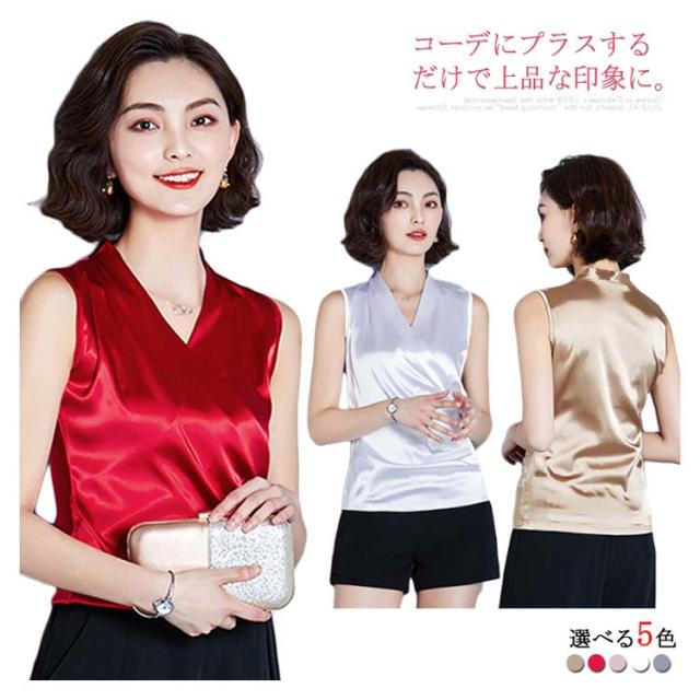 トップス タンクトップ シルク サテン レディース カシュクール フォーマル カジュアル ブラウス ノースリーブ トップス 袖なし 通勤 OL オフィス 光沢 着痩せ Vネック ブラウス インナー レイヤード ファッション おしゃれ 優雅 エレガント送料無料