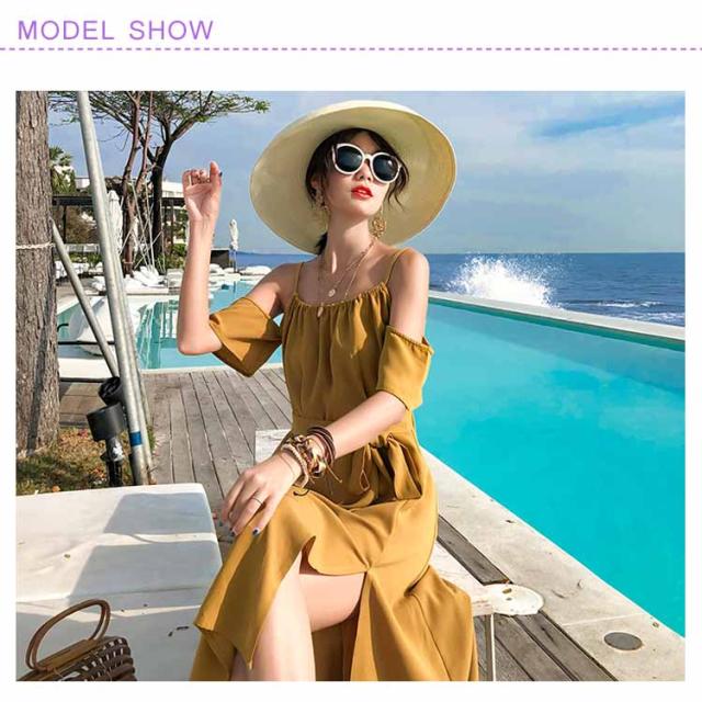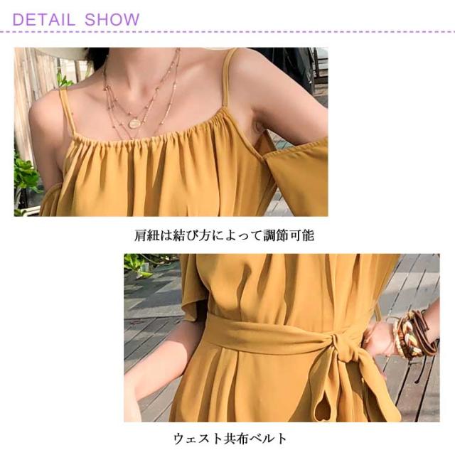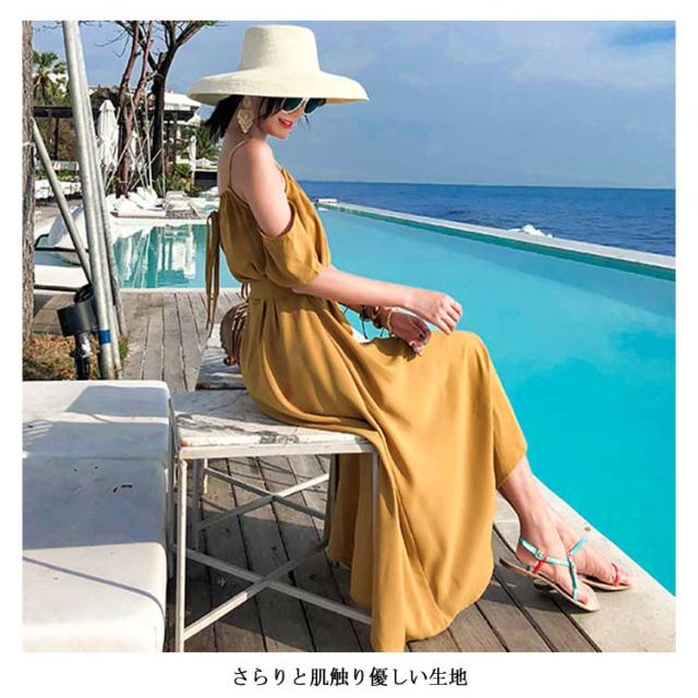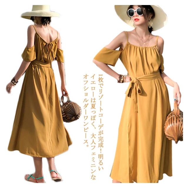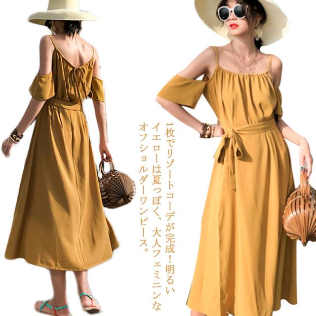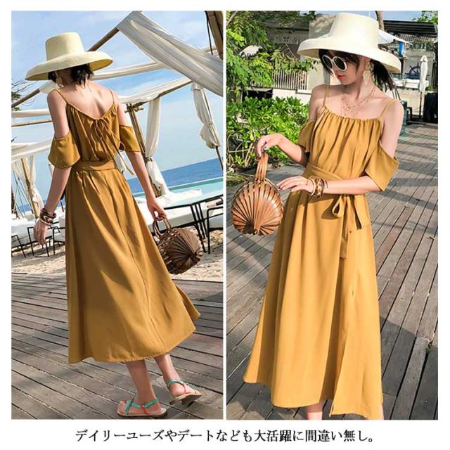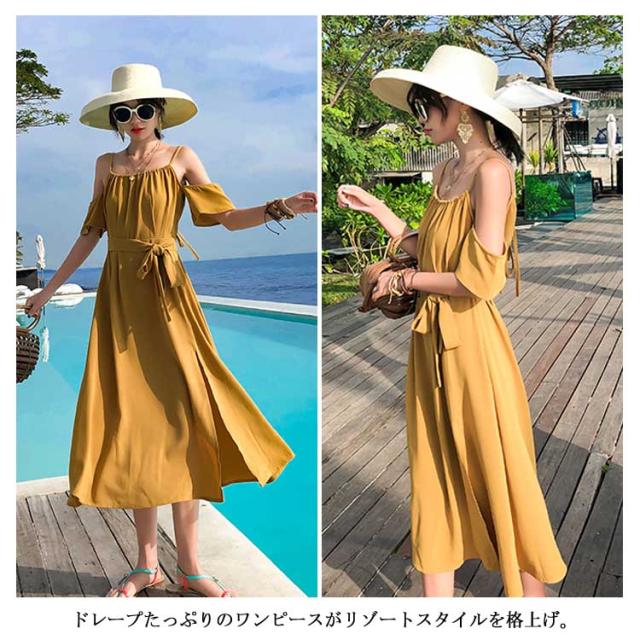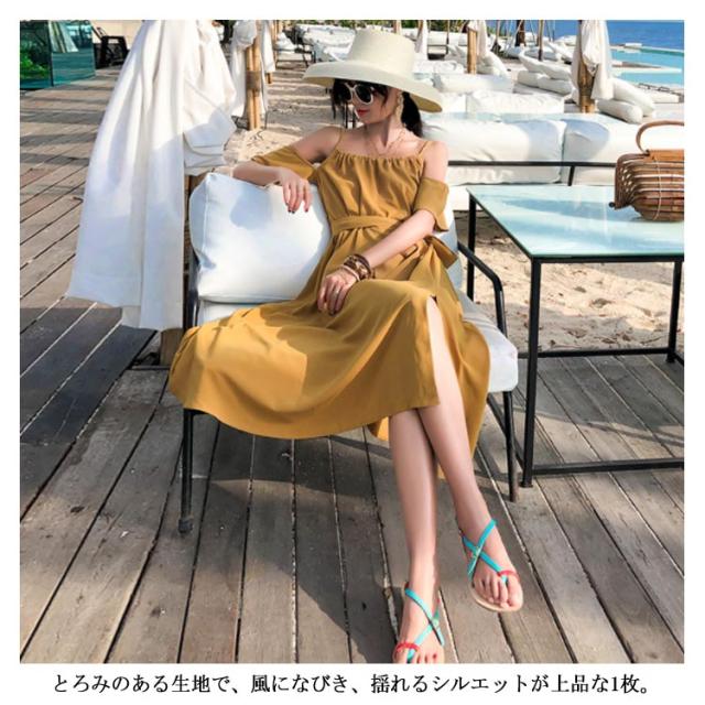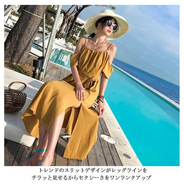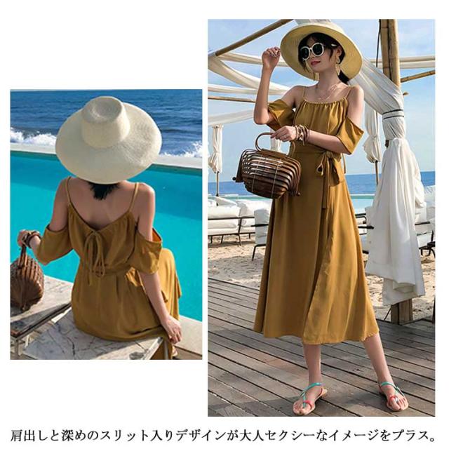 リゾートワンピース オフショルダー ワンピース キャミワンピ レディース リボンベルト付き キャミソールワンピース オフショルダーワンピース 肩出し フレア Aライン 深めスリット ドレープ シワになりにくい とろみ送料無料