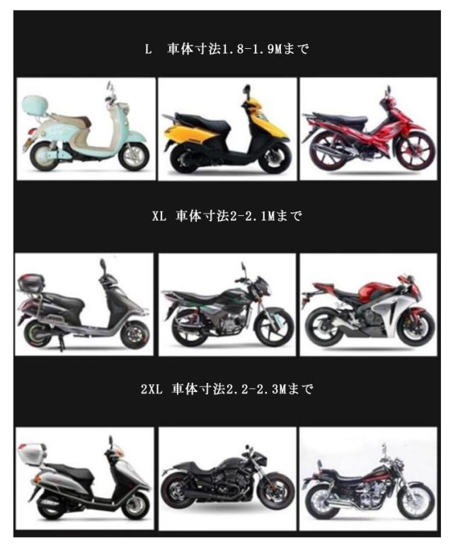 | サイズについての説明 | S 車体寸法1.6Mまで M 車体寸法1.75Mまで L 車体寸法1.8-1.9Mまで XL 車体寸法2-2.1Mまで 2XL 車体寸法2.2-2.3Mまで |