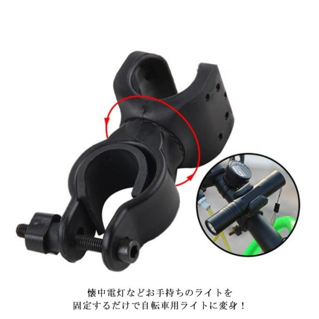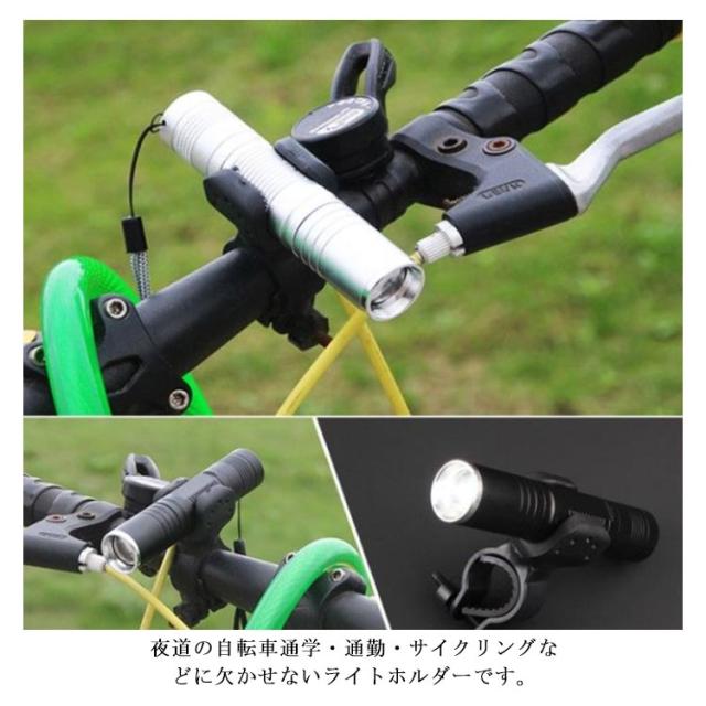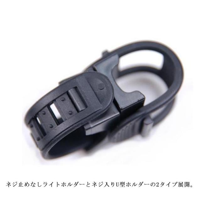 | 360度回転できる自転車ライトホルダー。 懐中電灯などお手持ちのライトを固定するだけで自転車用ライトに変身! ネジ止めなしライトホルダーとネジ入りU型ホルダーの2タイプ展開。 夜道の自転車通学・通勤・サイクリングなどに欠かせないライトホルダーです。 | |