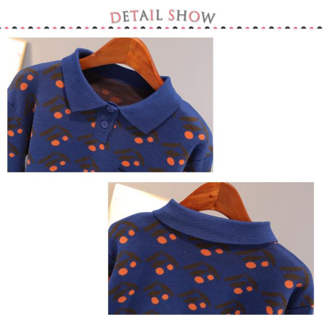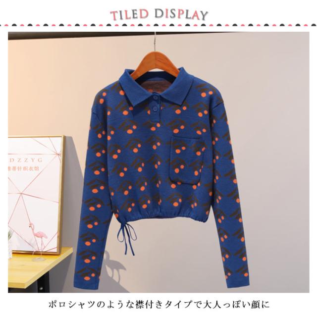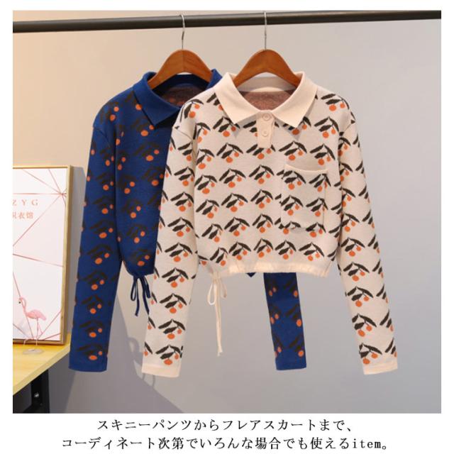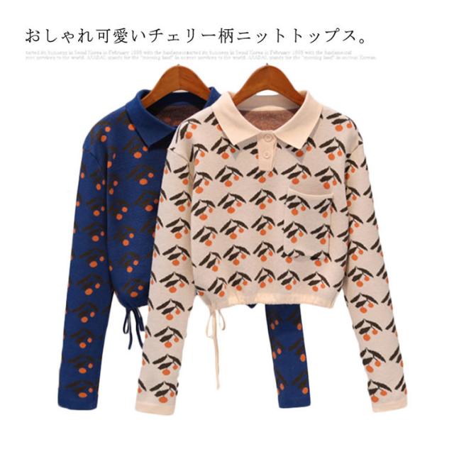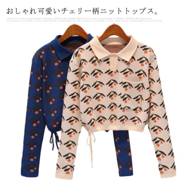 チェリー柄ニット ポロシャツ ポロ襟 ニットトップス ショート丈 ハイウエストニット ニットソー レディース ニットウエア ニット セーター 長袖 おしゃれ かわいい 春 秋 冬