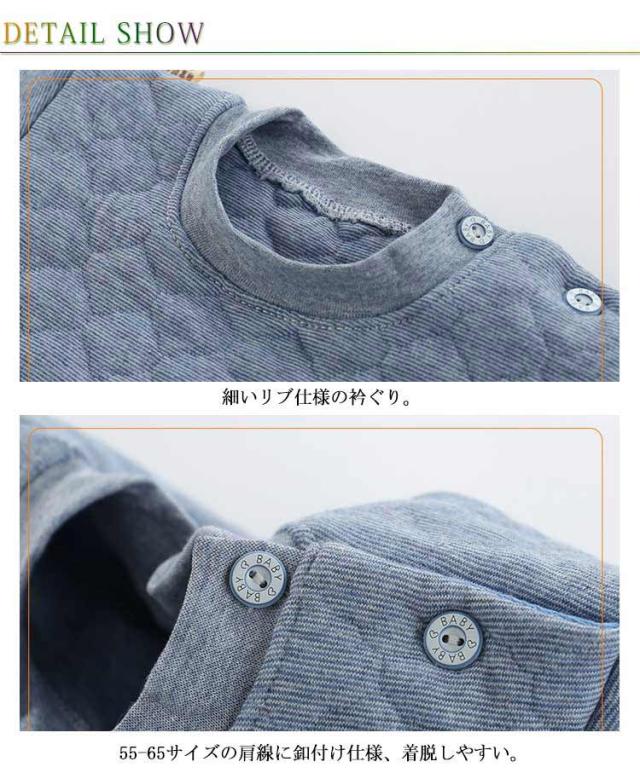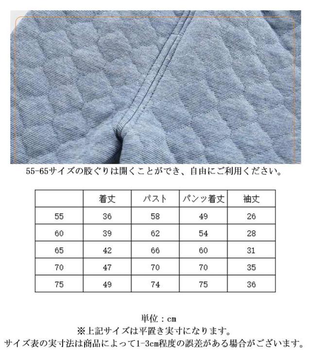 | 選べる4色!赤ちゃんのお肌に優しい綿素材のパジャマ。 細いリブ仕様の衿ぐり。 55-65サイズの肩線に釦付け仕様、着脱しやすい。 袖口冷気をしっかり遮断するリブ仕様。 ウエストゴム仕様、楽に履けます。 55-65サイズの股ぐりは開くことができ、自由にご利用ください。 部屋着としてもパジャマとしても大活躍。 男の子も女の子も性別を問わないシンプルなデザインで、幅広くご愛用。 | |