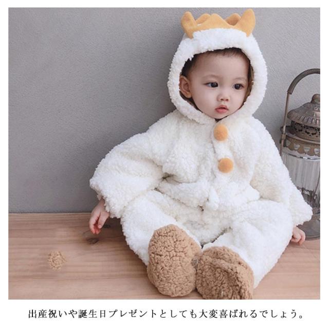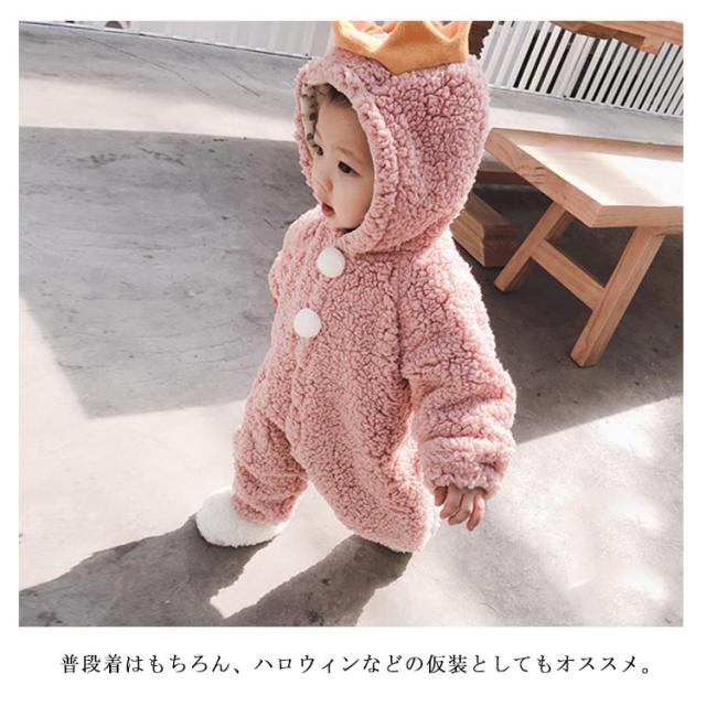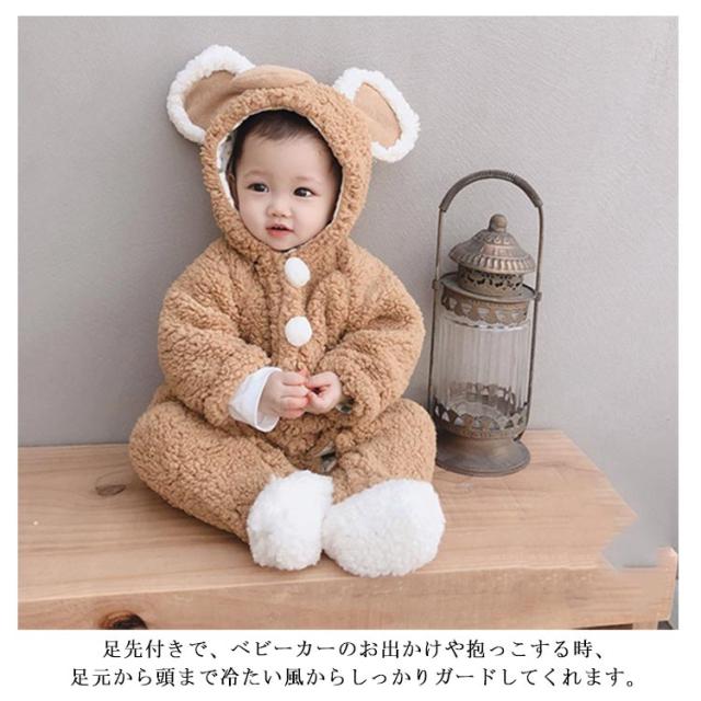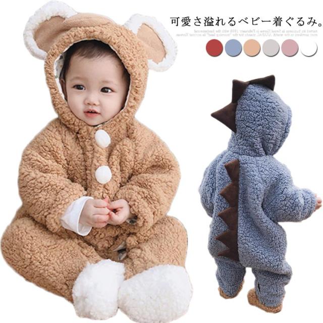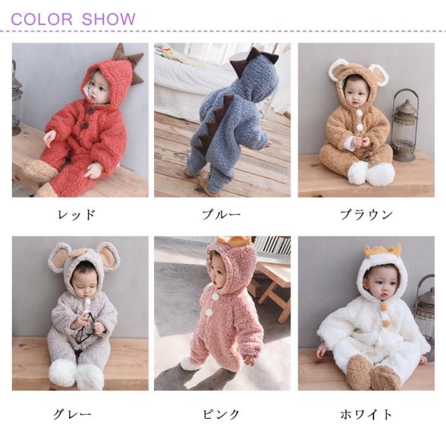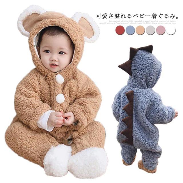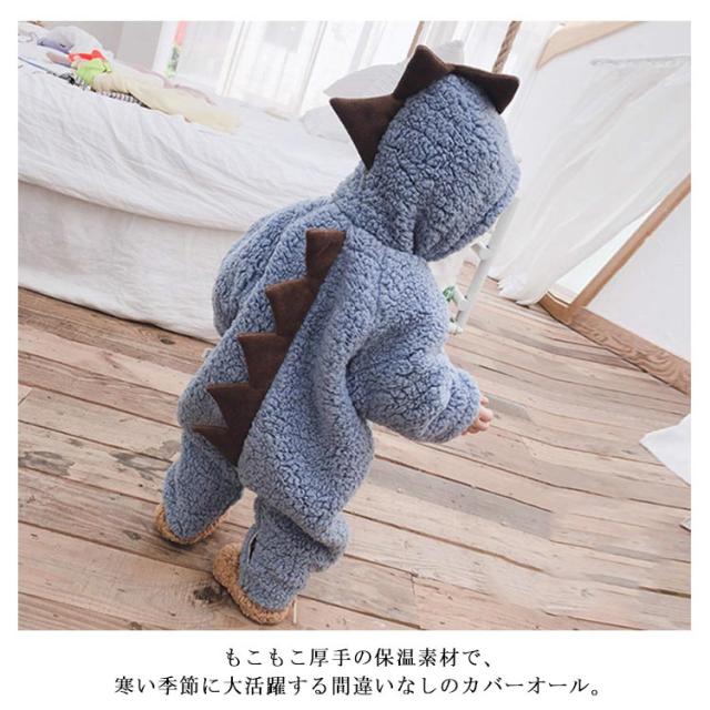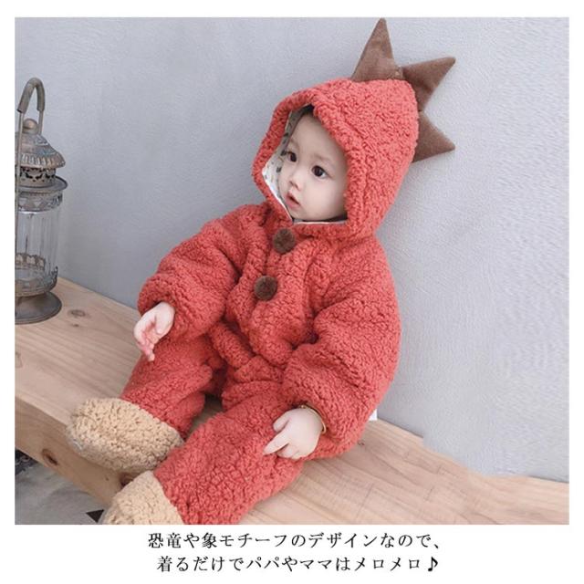 ボア ロンパース カバーオール ベビー 赤ちゃん 新生児 恐竜 足つき 足なし フード付き 動物 可愛い もこもこ 秋冬 ジャンプスーツ お出かけ 73 80 90 100
