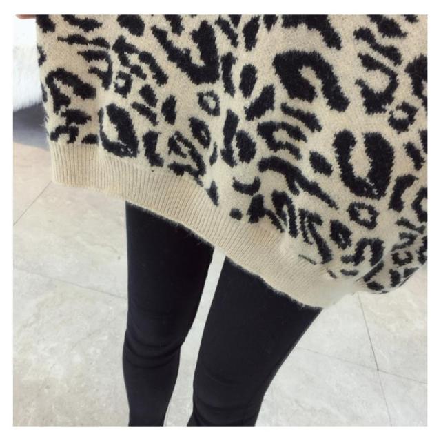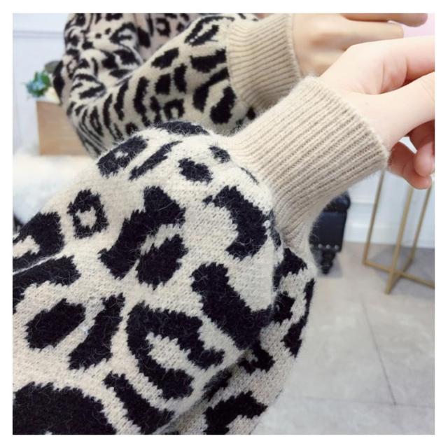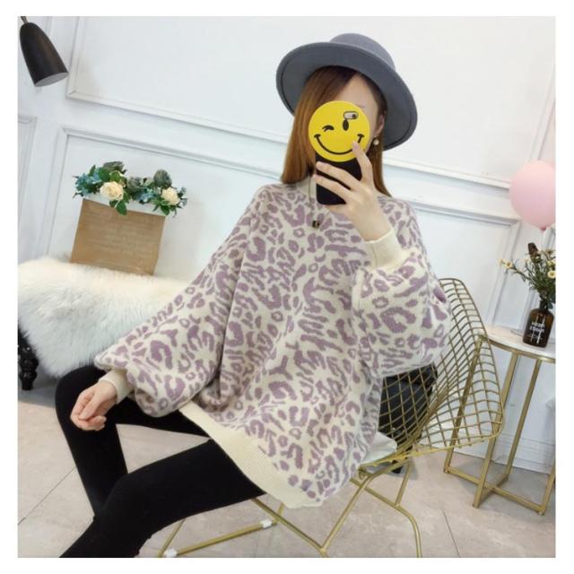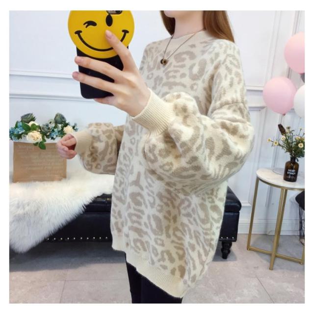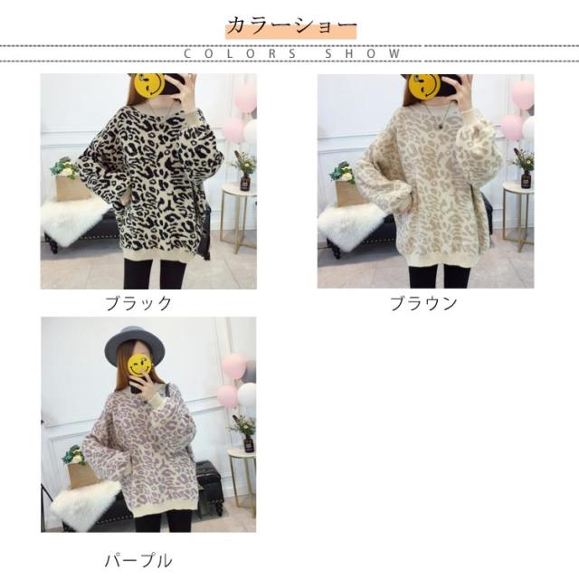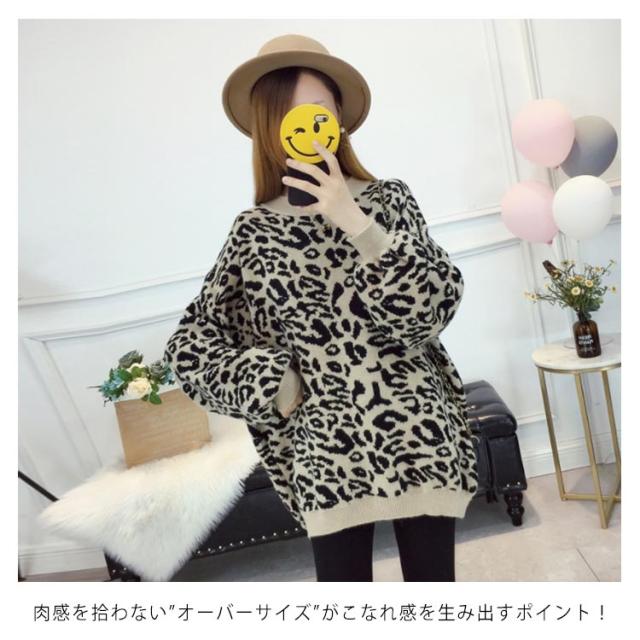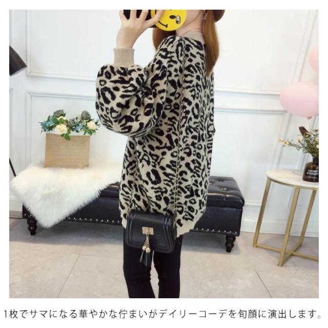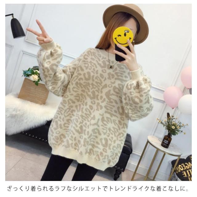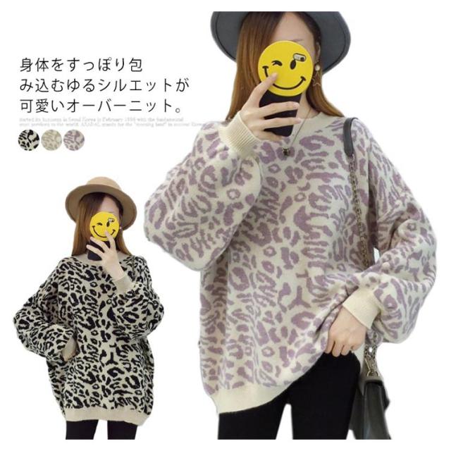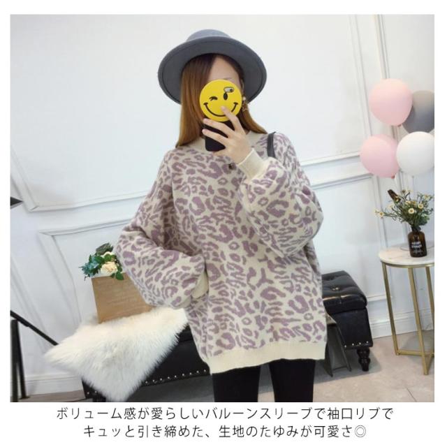 レオパード柄オーバーニット バルーンスリーブ ニット レオパード柄 ヒョウ柄 ニット セーター プルオーバー ラウンドネック レディース トップス 大きサイズ ゆったり トレンド 秋 冬