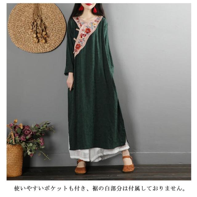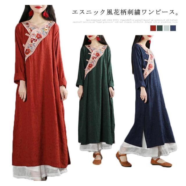 ワンピース マキシワンピース 長袖 花柄刺繍ワンピース マキシ丈 長袖ワンピース マキシ丈ワンピース 綿麻 花柄 刺繍 Vネック 春 秋