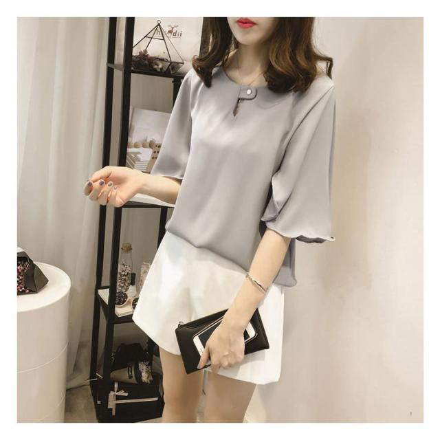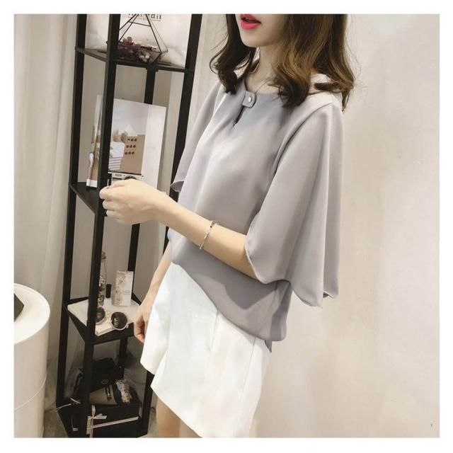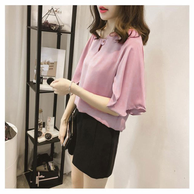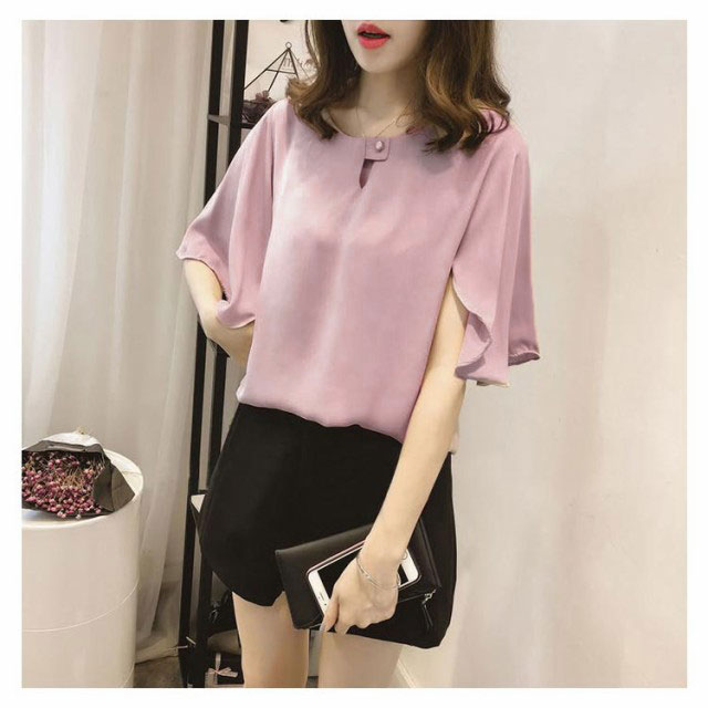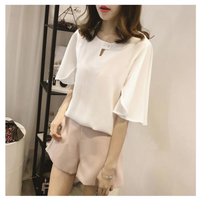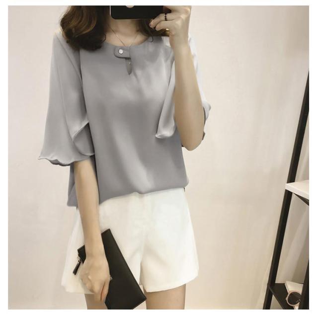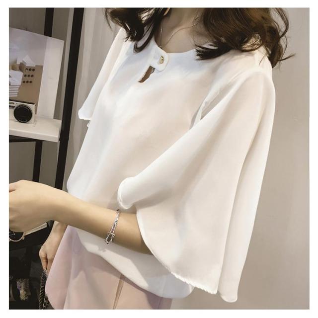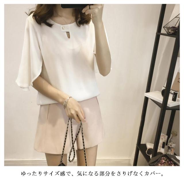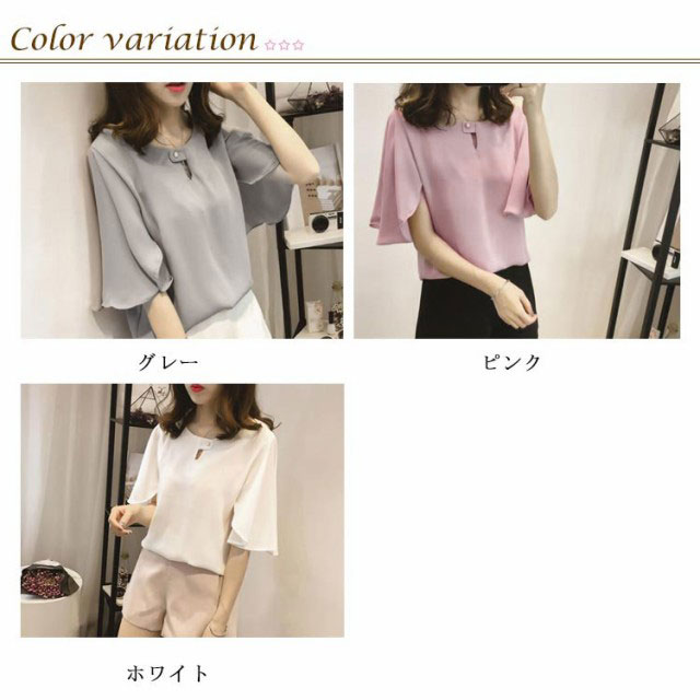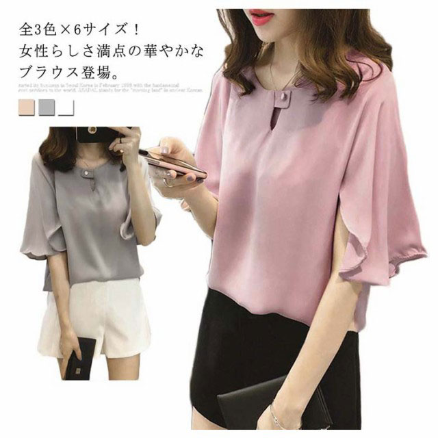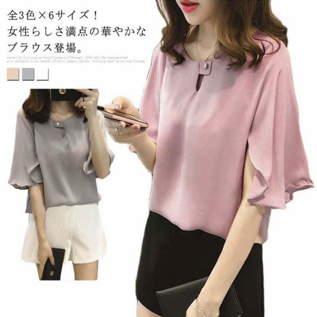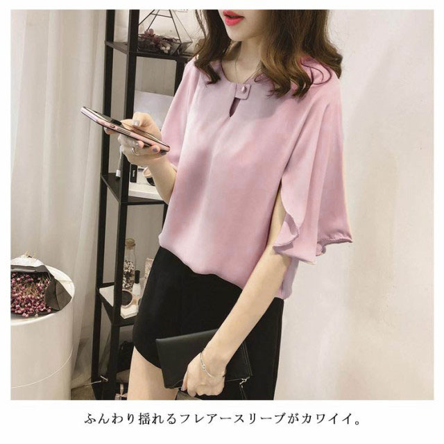 全3色×6サイズ!シフォントップス フレアスリーブ シャツ ブラウス 5分袖ブラウス ワイドスリーブ プルオーバー トップス とろみシャツ フレア袖 ゆったり 可愛い 無地 夏服 レディース