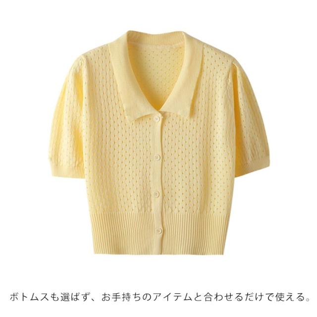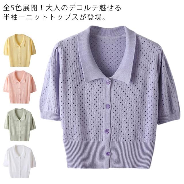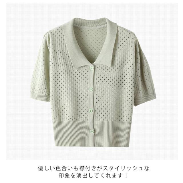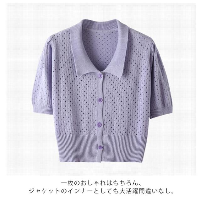 全5色!襟付きニットトップス ニットカーディガン ニットtシャツ 半袖カーディガン サマーカーディガン 透け感編み カーディガン サマー ショート丈 シンプル 無地 春夏 レディース