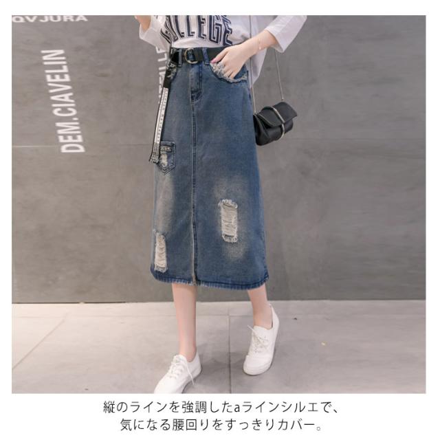 デニムスカート ミディアム ダメージ加工 スカート ロングスカート ハイウエスト aラインスカート フロントスリット カジュアル ゆったり 春 夏 秋 おしゃれ 可愛い 大きサイズ