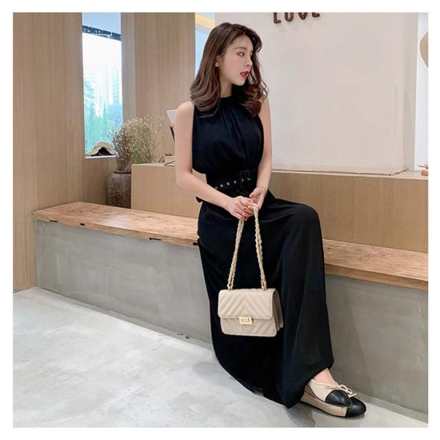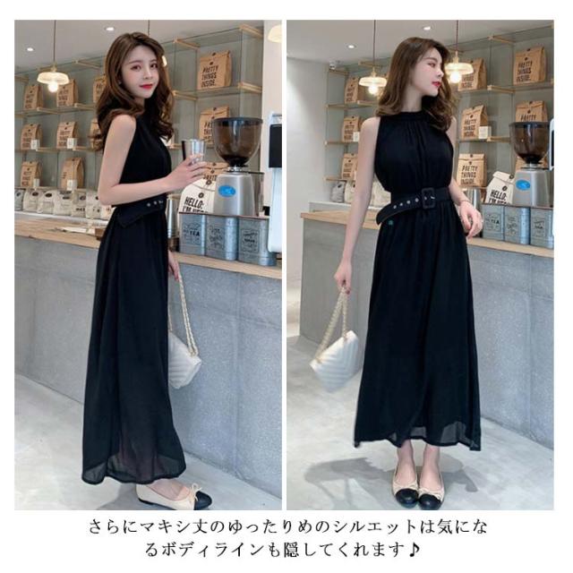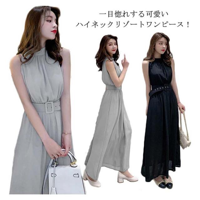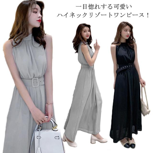 ハイネックマキシワンピース シフォンワンピース マキシ丈 ノースリーブワンピース ハイネック ワンピース 夏ワンピース ビーチワンピース マキシワンピ マキシ丈ワンピース 袖なし ふんわり ウエストベルト付き