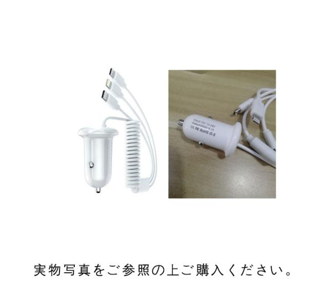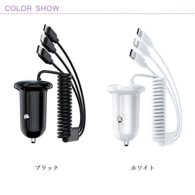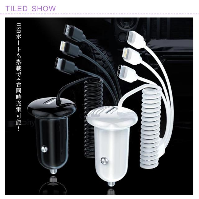 3in1ケーブル一体型 カーチャージャー 4台 同時充電 アイフォン Micro USB Type-C 対応 シガーソケット USB充電アダプタ 急速充電 車載 車 12V 24V 乗用車 大型車 タブレット スマートフォン カメラ