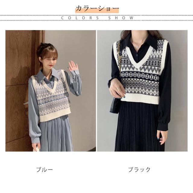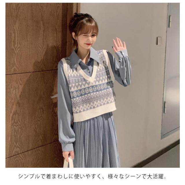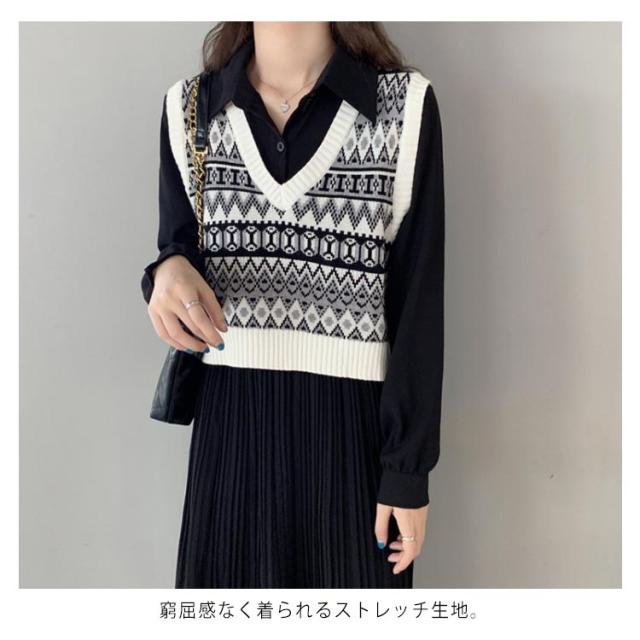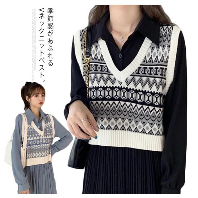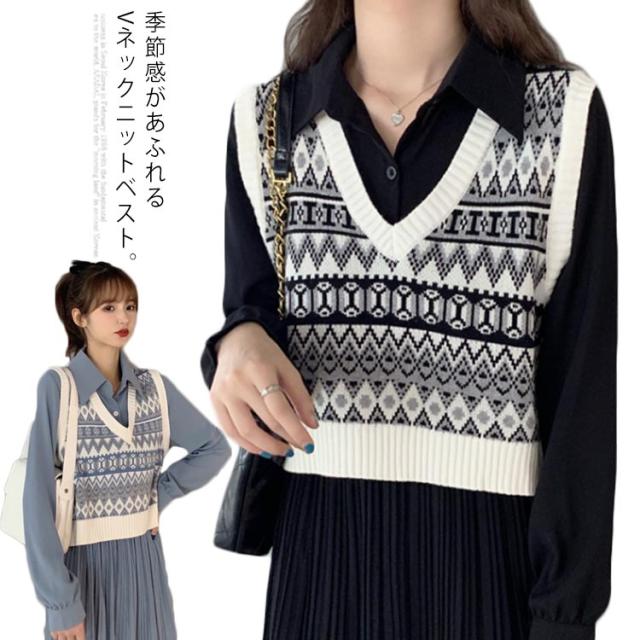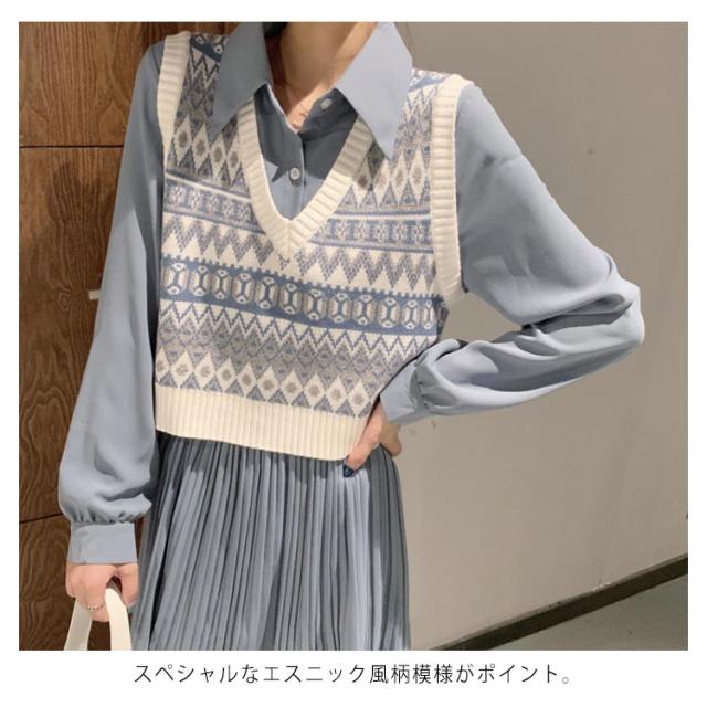 ニットベスト レディース ベスト ニットトップス リブニット Vネック ショート丈 エスニック柄 ノースリーブ プルオーバー トップス ゆったり 重ね着 レイヤード お洒落 カジュアル 春新作