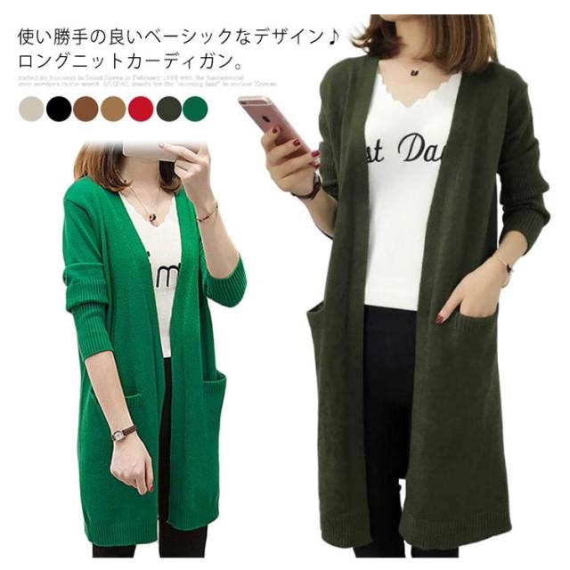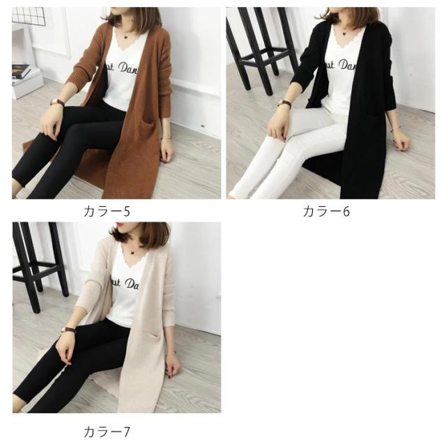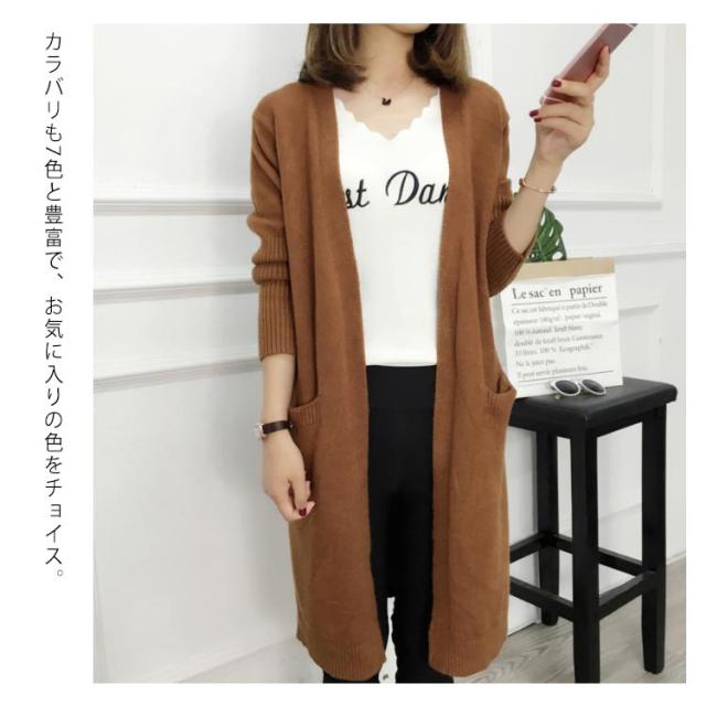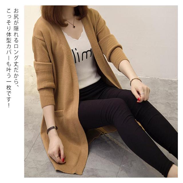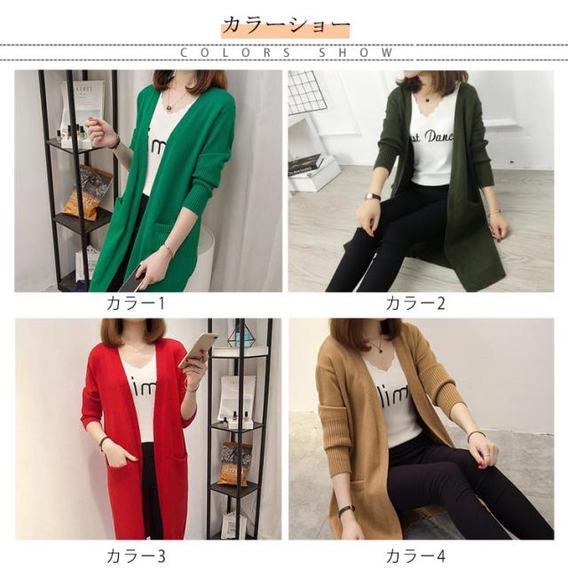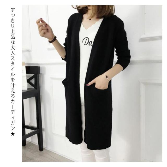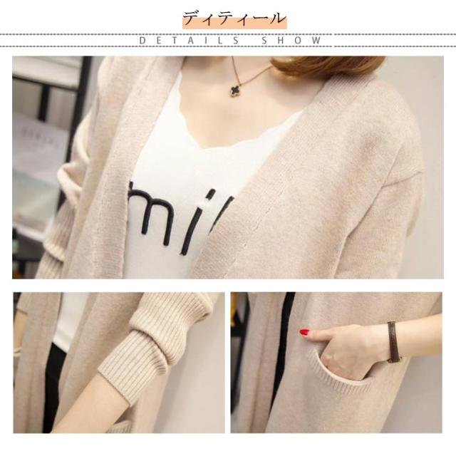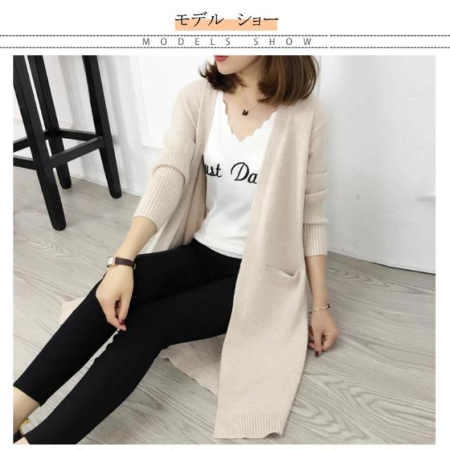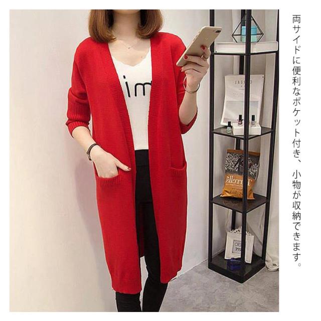 ニットカーディガン レディース ロングカーディガン 長袖カーディガン コーディガン 羽織り物 トップス 無地 Vネック ロング丈 シンプル ポケット付き カジュアル ルーズ ゆったり 体型カバー 春 秋 冬