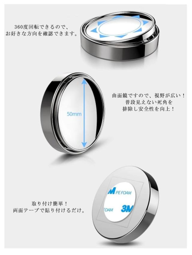 | 角度調整可能の車サイドミラーの補助ミラー。 360度回転できるので、お好きな方向を確認できます。 曲面鏡ですので、視野が広い!普段見えない死角を排除し安全性を向上! 取り付け簡単!両面テープで貼り付けるだけ。 バックする時の白線位置の確認や右左折時自転車や子供などの巻き込み事故予防に役たつ。 普通車に限らず、SUV、トラックなど様々な車種に対応できます。 | |