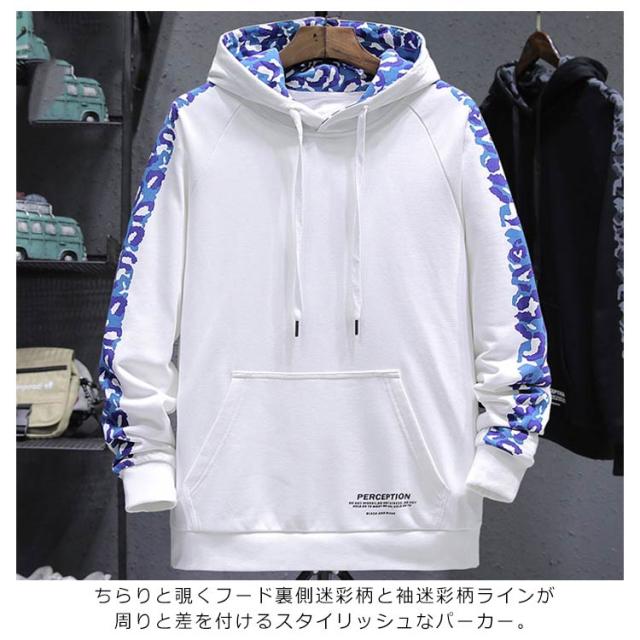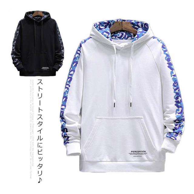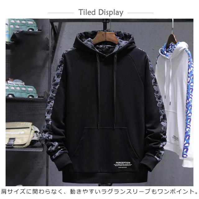 | ストリートスタイルにピッタリ♪ ちらりと覗くフード裏側迷彩柄と袖迷彩柄ラインが周りと差を付けるスタイリッシュなパーカー。 Lサイズから8XLサイズまで全9サイズから選べるから、ジャストサイズもオーバーサイズもチョイスできます。 肩サイズに関わらなく、動きやすいラグランスリーブもワンポイント。 | |