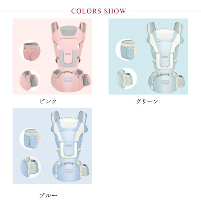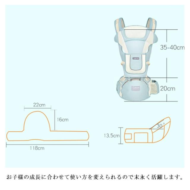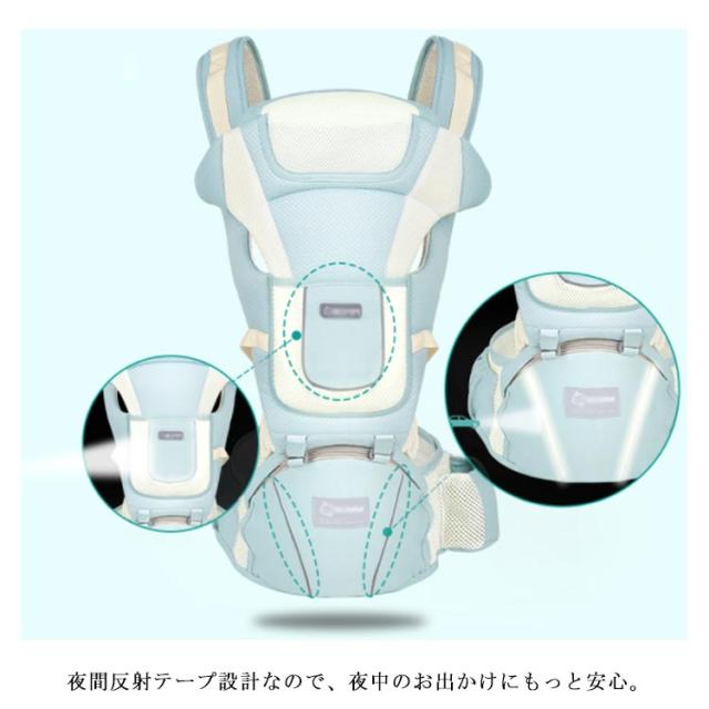 | サイズについての説明 | 対象年齢:3ヶ月〜36ヶ月まで ○ウエストサイズ:ウエスト最大90cmまでベルト調節可能 ○耐荷重:30kgまで ○仕様:抱っこひも&ヒップシート分離型、男女兼用、反射板付 |