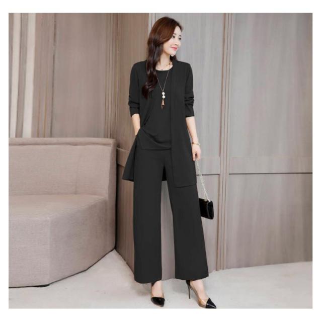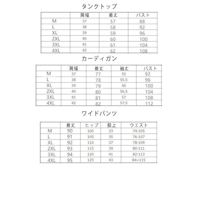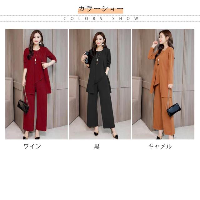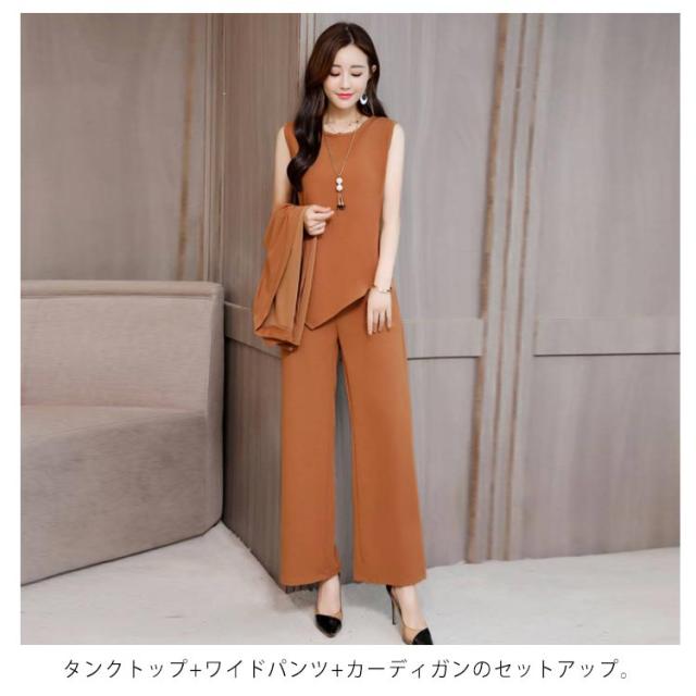 | タンクトップ+ワイドパンツ+カーディガンのセットアップ。 セットアップでスタイル格上げ♪ 程よい生地の厚さは上下それぞれ単品でも大活躍しちゃうこと間違いありません! ビジネスシーンから、パーティー、フォーマルまでいろいろなシーンで活躍すること間違いなし。 | |