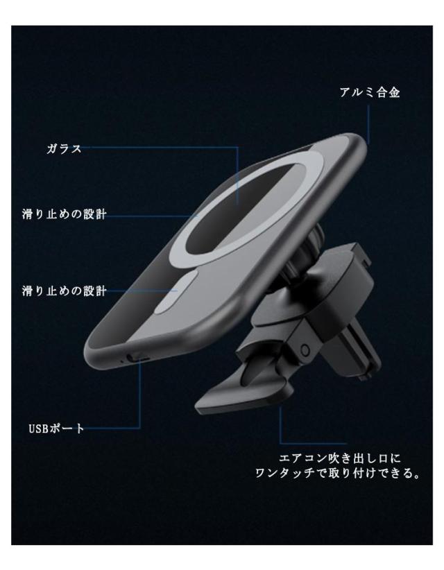 | (商品名)ワイヤレス充電器 (電圧)15W (素材)ABS ガラス アルミ合金 (サイズ)F (特徴)磁石で自動吸着タイプ★置くだけでワイヤレス充電可能。車載ホルダーとワイヤレス充電器を一体化したアイテム。高性能スマートチップを搭載し、過充電、過電流、過電圧、過熱、高温防止の保護機能付きで、スマホのバッテリーの安全も確保。 | |