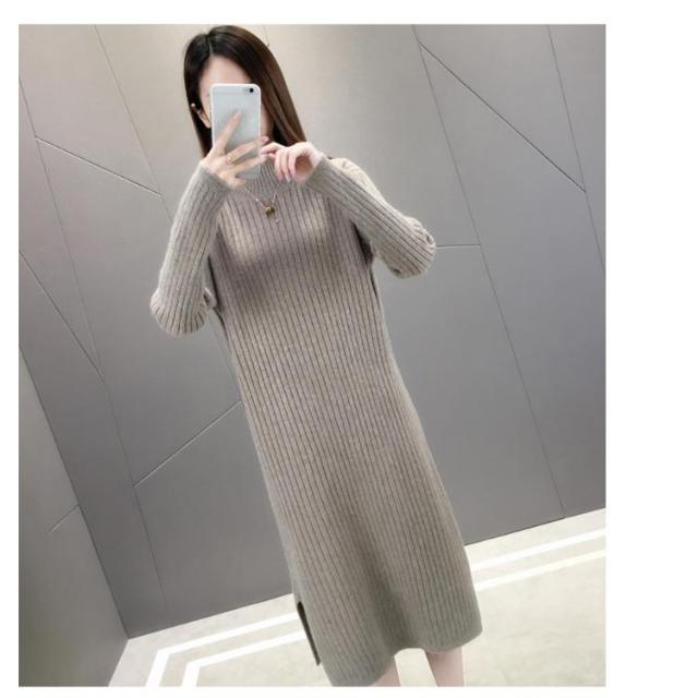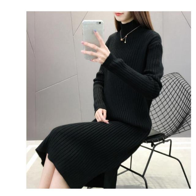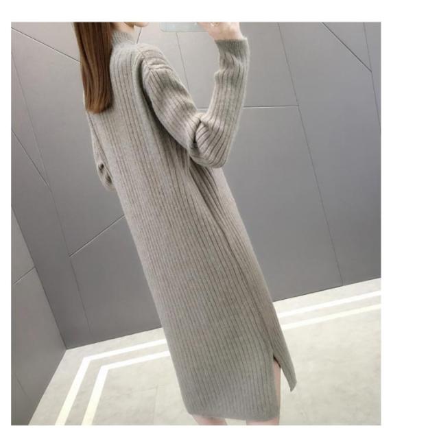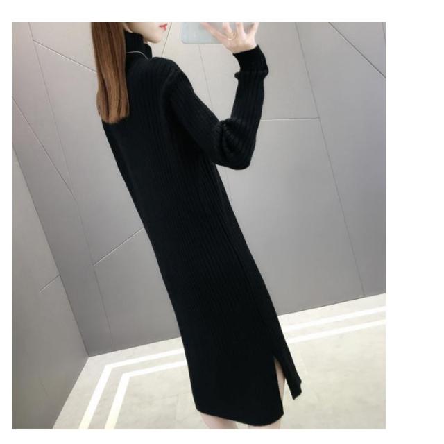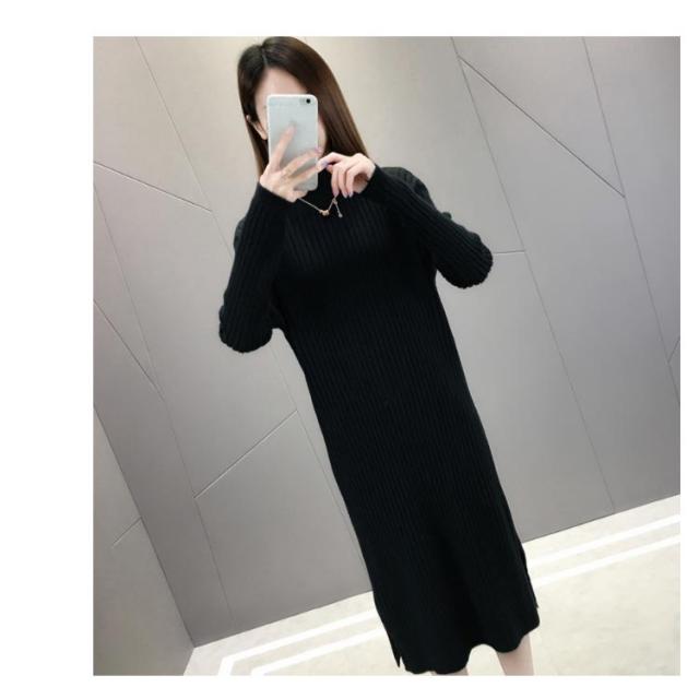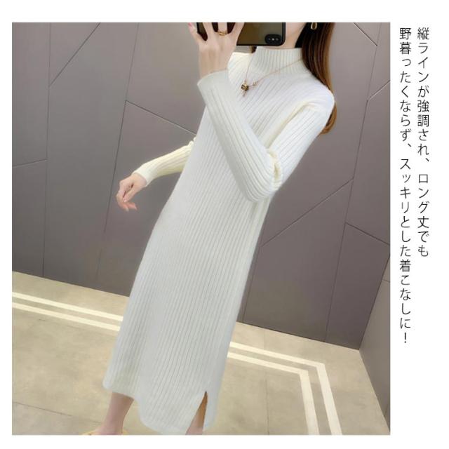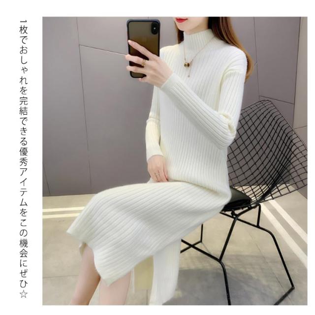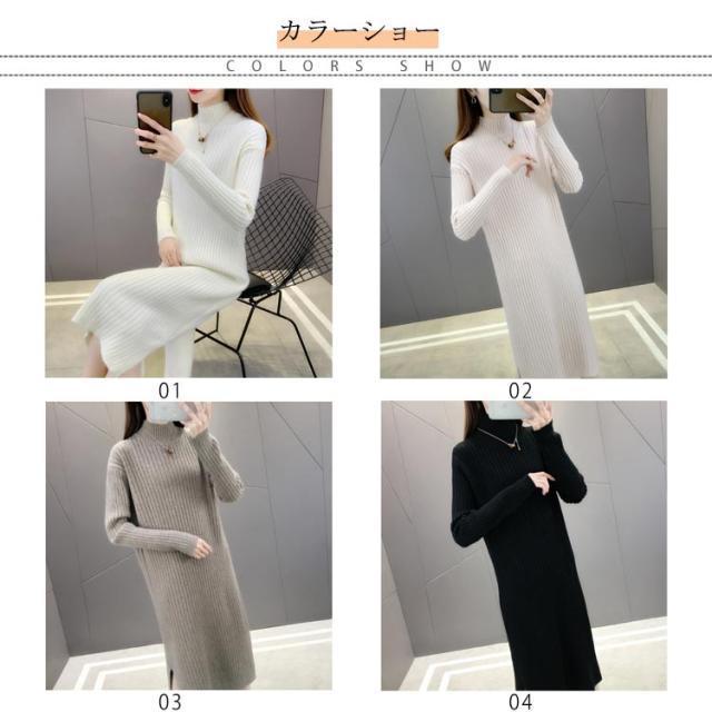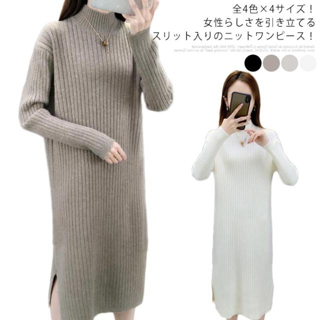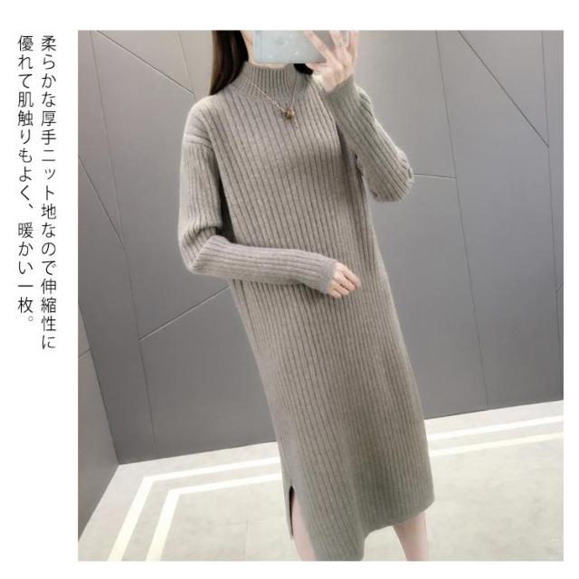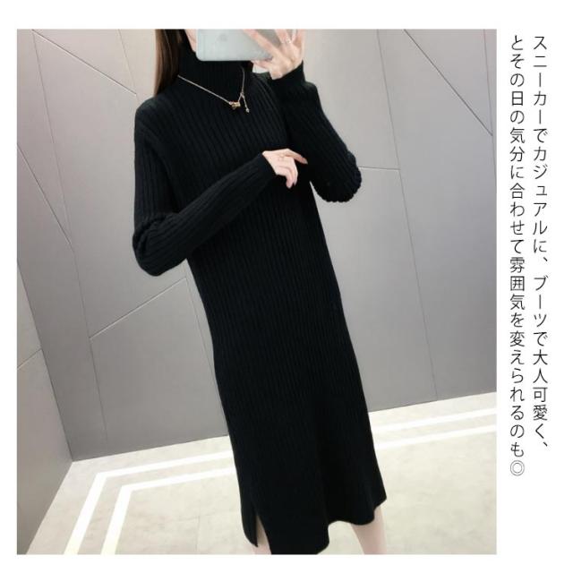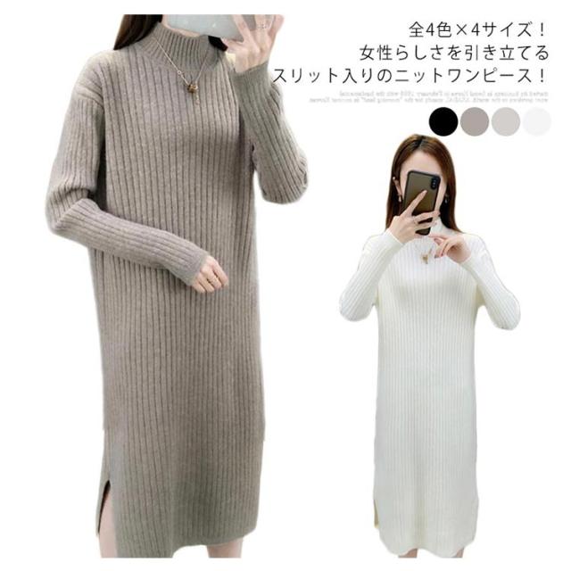 全4色×4サイズ!ニットワンピース ハイネック ニット ワンピース ニットワンピ ハイネックワンピース スリット 膝下丈 ロング丈 厚手 秋冬 冬物 冬服 ゆったり おしゃれ