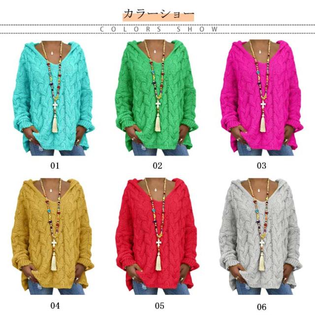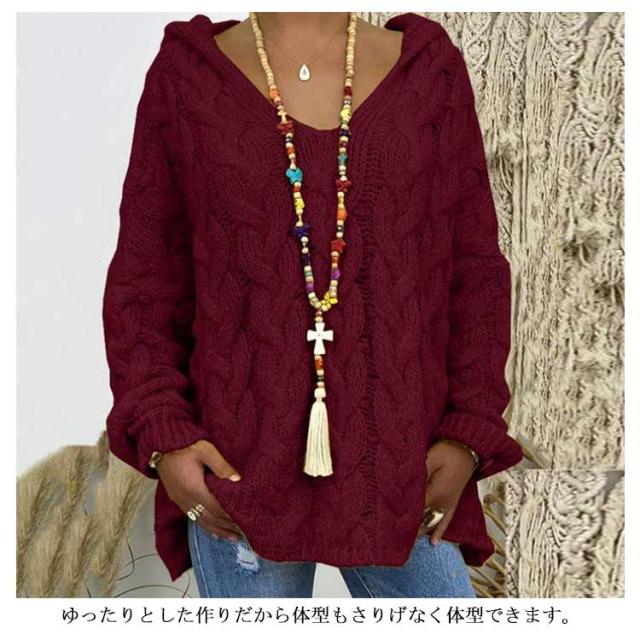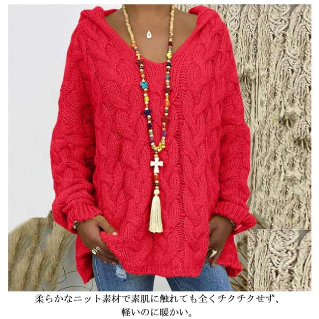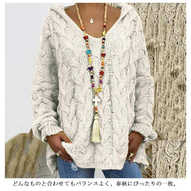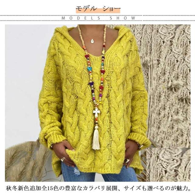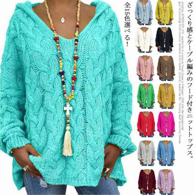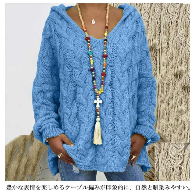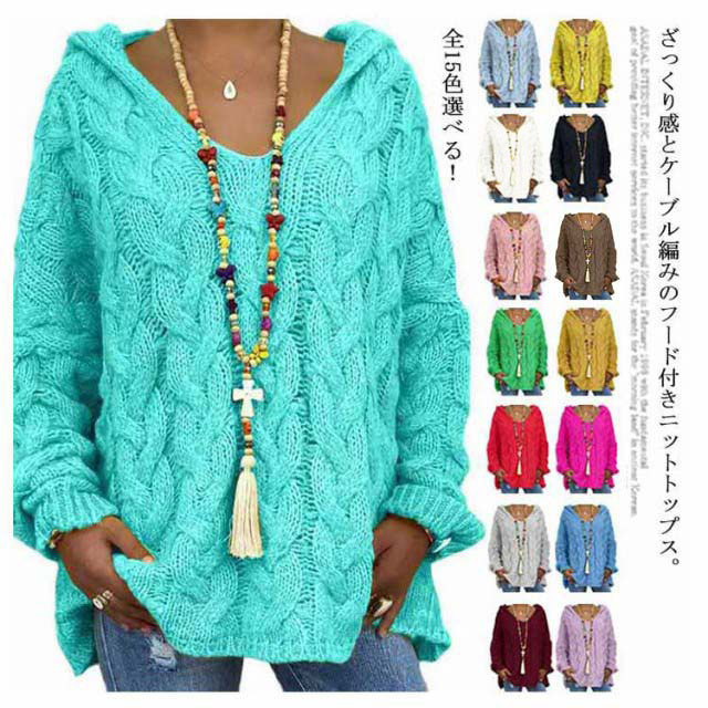 秋冬新色追加全15色!ケーブル編みニットトップス プルオーバーニット ざっくりニット レディース ニット セーター トップス フード付き ゆったり 大きサイズ 秋 冬 カジュアル ケーブル