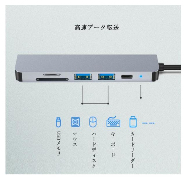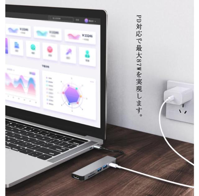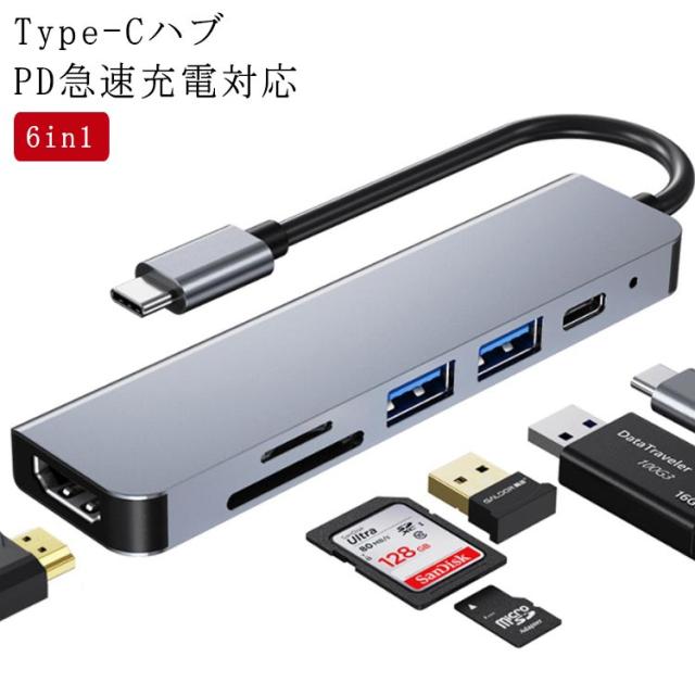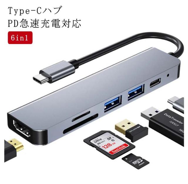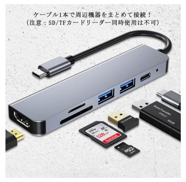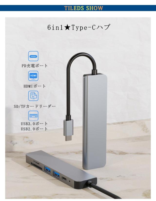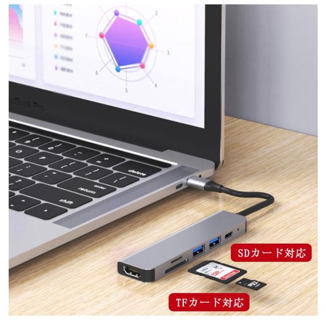 6in1 USB Type-Cハブ PD充電 USBハブ HDMI出力 USBポート SDカードリーダー TFカードリーダ メモリーカードリーダー タイプC ハブ Type-C 変換アダプタ 変換ケーブル MacBook iPad Pro対応 4K/30Hz ノートパソコン ノートPC 送料無料