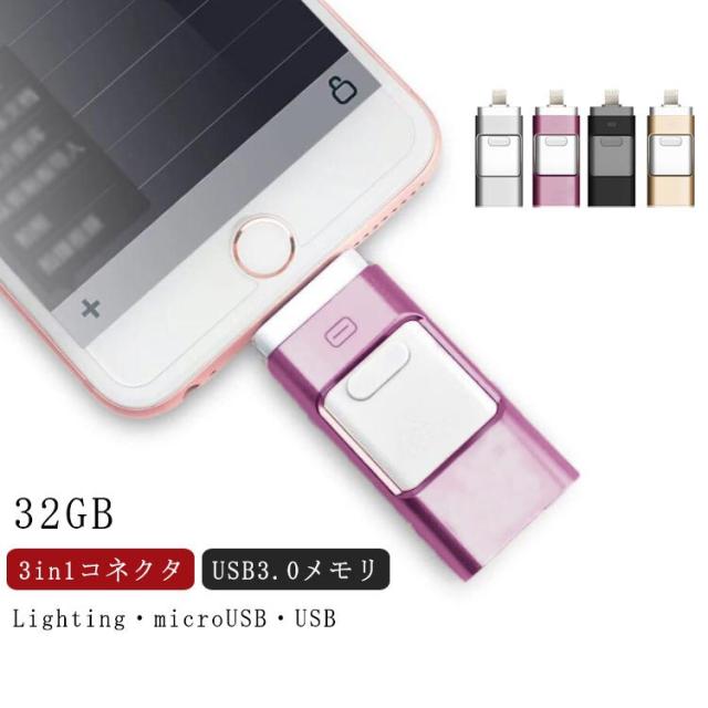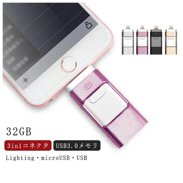 3in1 コネクタ USBメモリ USB3.0 32GB iPhone iPad PC Android Mac用 usbメモリー スマホ 容量拡張 容量不足 ストレージ 高速転送 フラッシュメモリー スライド式 高速 大容量 小型 USB フラッシュドライブ コンパクト iOS8以降のシステム 送料無料