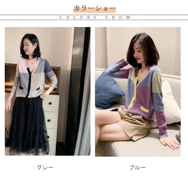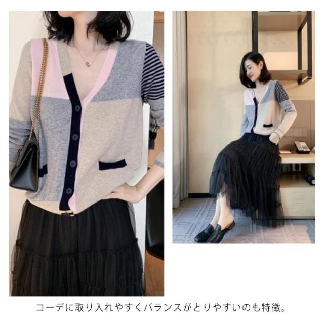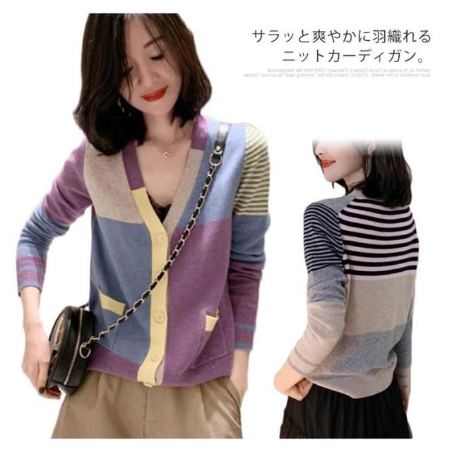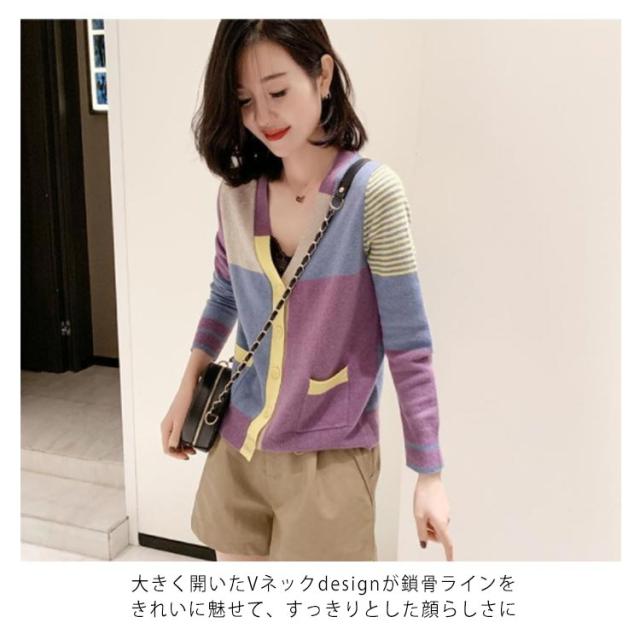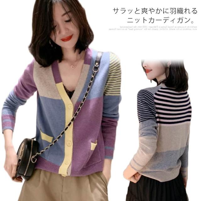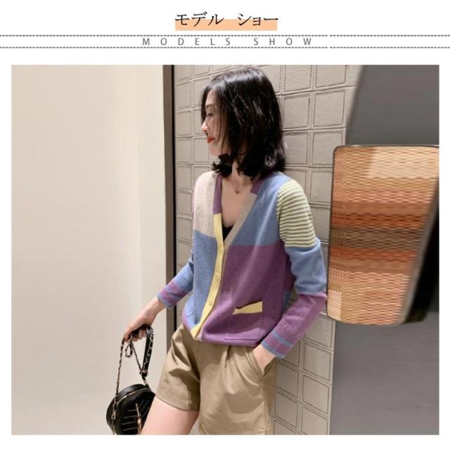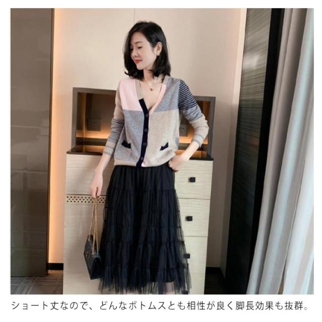 送料無料 配色カーディガン ニットカーディガン ショート丈 ニット カーディガン Vネック 羽織り トップス おしゃれ 可愛い 春服 春物 レディース