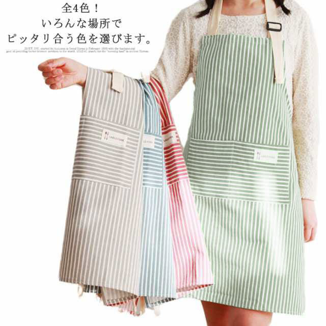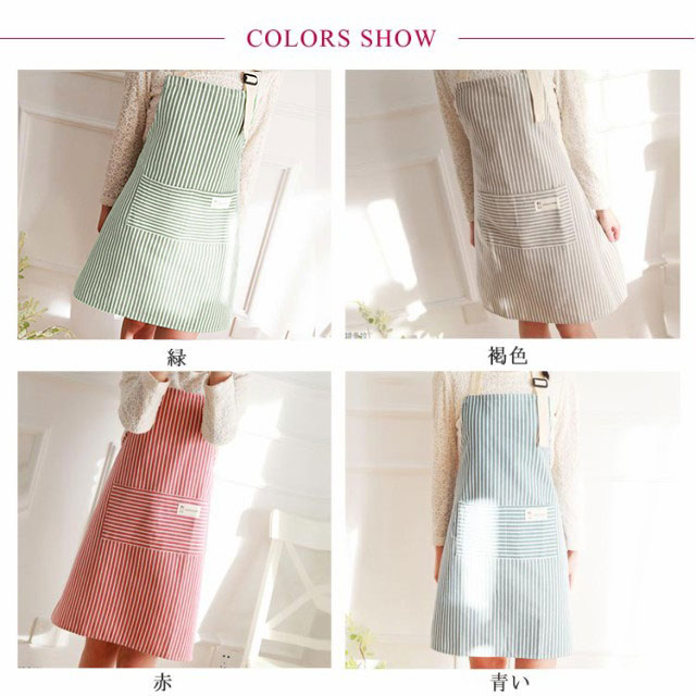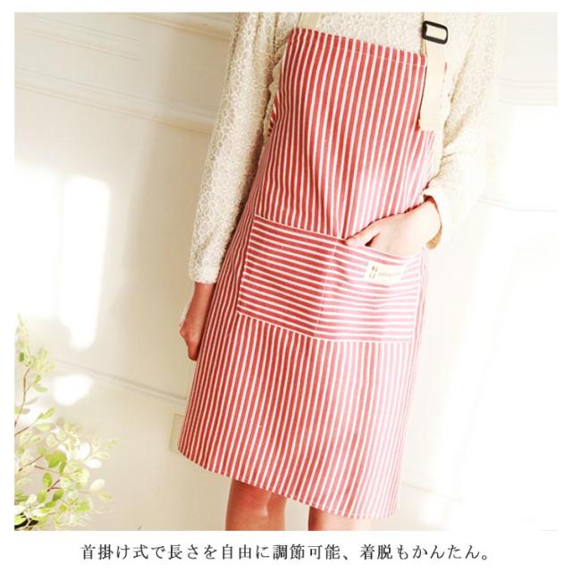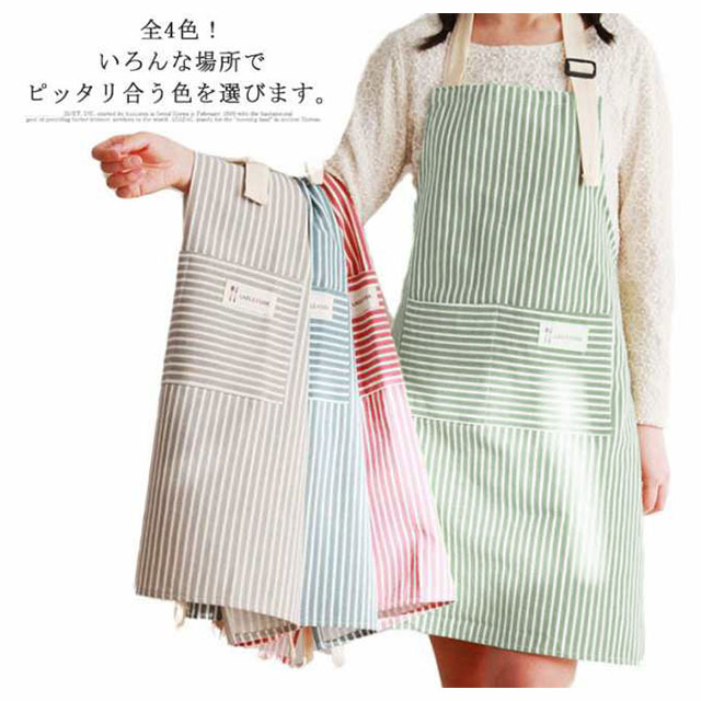 | 全4色!いろんな場所でピッタリ合う色を選びます。 丁寧な縫製なのでしっかり丈夫! 首掛け式で長さを自由に調節可能、着脱もかんたん。 シンプルなストライプエプロンで、プレゼントとしては最適! 多いものを収納できるポケット付き、気兼ねなく料理や家事ができます。 | |