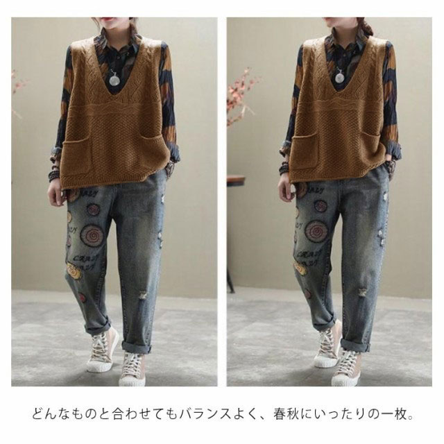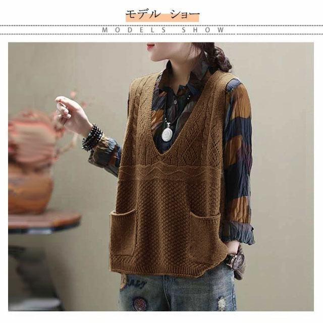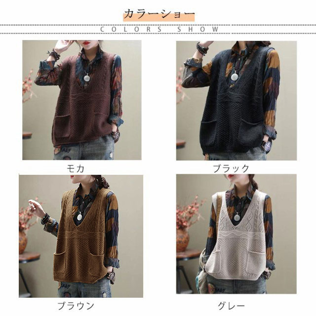 送料無料 全4色×5サイズ!チュニックニット ニットベスト 大きサイズ ニットトップス ニット ベスト ポケット付き Vネック ゆるニット ゆったり 体型カバー 春 秋 おしゃれ レディース