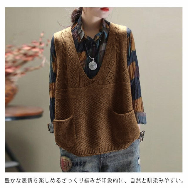 | 全4色×5サイズ!おしゃれ度とこなれ感が増すニットベスト。 豊かな表情を楽しめるざっくり編みが印象的に、自然と馴染みやすい。 深めVネックデザインですっきりした印象を与えて、襟付きのトップスと好相性。 柔らかなニット素材で素肌に触れても全くチクチクせず、軽いのに暖かい。 どんなものと合わせてもバランスよく、春秋にいったりの一枚。 | |