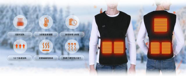 加熱ベストは日本製のポリエステル生地を採用しており、着用すると軽くて柔らかく、静電気が発生しにくいです。バッテリーが切れても中綿ベストとして着用すると暖かさが持続するため、普段はジャケットの下に着用することも可能です。 USBポートには防水キャップが付いており、使用しないときはキャップしておくこともでき、外さずに丸洗いできるほか、洗濯機で丸洗いも可能です。 (洗濯ネットに入れることをおすすめします)