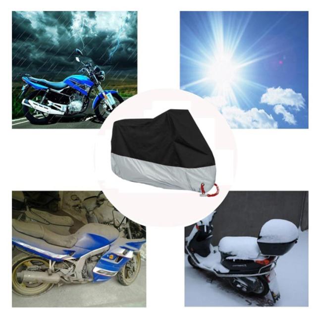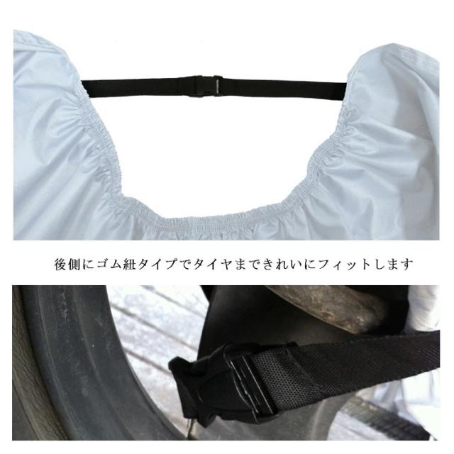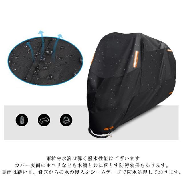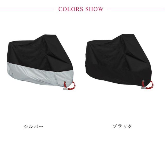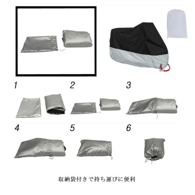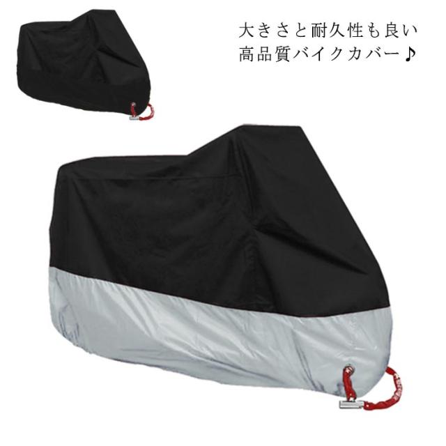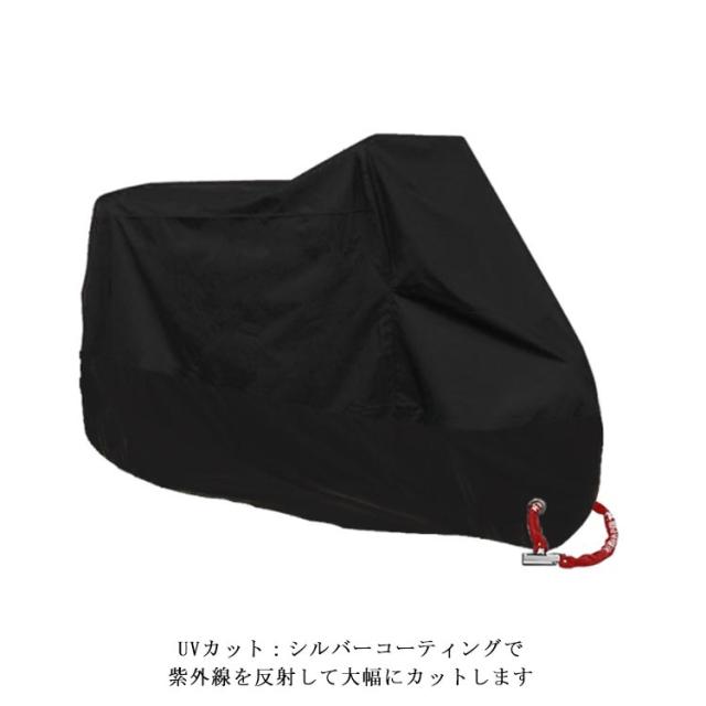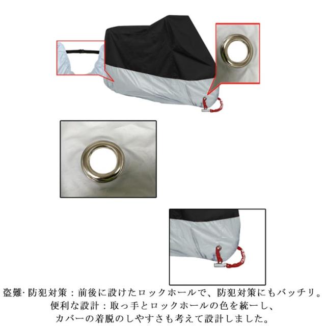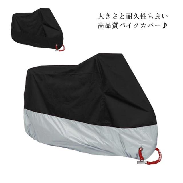 | 大きさと耐久性も良い高品質バイクカバー 風飛び防止:アンダーベルト付き、しっかりして風にも飛びません 撥水加工:表面撥水加工で撥水効果抜群 雨粒や水滴は弾く撥水性能はございます カバー表面のホコリなども水滴と共に落とす防汚効果もあります。 裏面は縫い目、針穴からの水の侵入をシームテープで防水処理しております。 盗難?防犯対策:前後に設けたロックホールで、防犯対策にもバッチリ。 便利な設計:取っ手とロックホールの色を統ーし、カバーの着脱のしやすさも考えて設計しました。 後側にゴム紐タイプでタイヤまできれいにフィットします UVカット:シルバーコーティングで紫外線を反射して大幅にカットします 収納袋付きで持ち運びに便利 | |