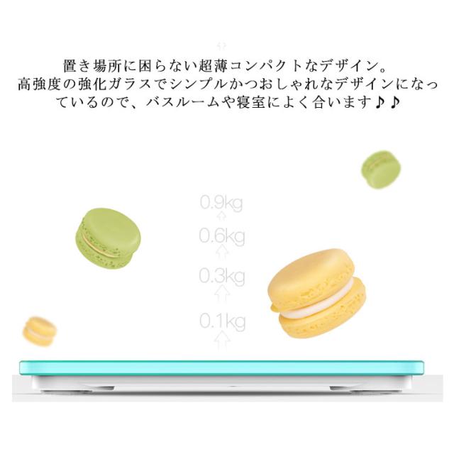 | 置き場所に困らない超薄コンパクトなデザイン。 高強度の強化ガラスでシンプルかつおしゃれなデザインになっているので、バスルームや寝室によく合います♪♪ | |