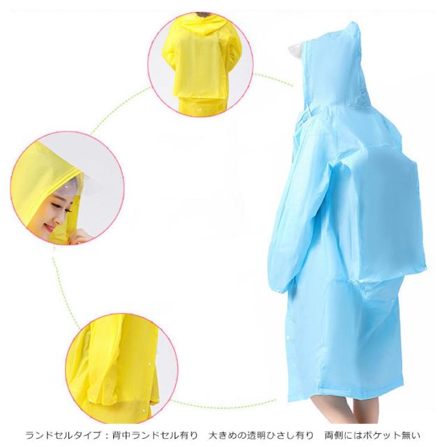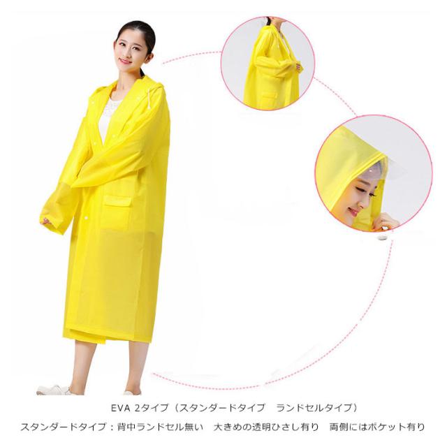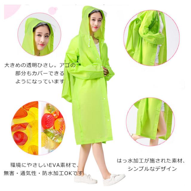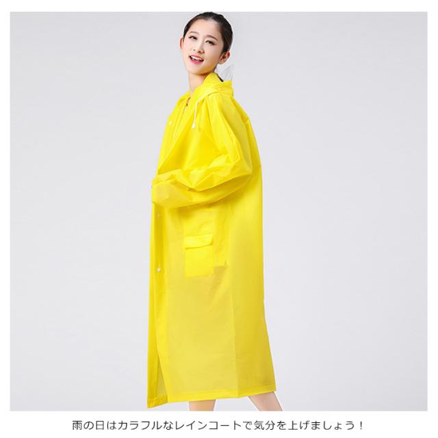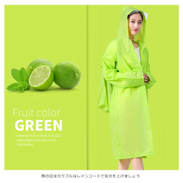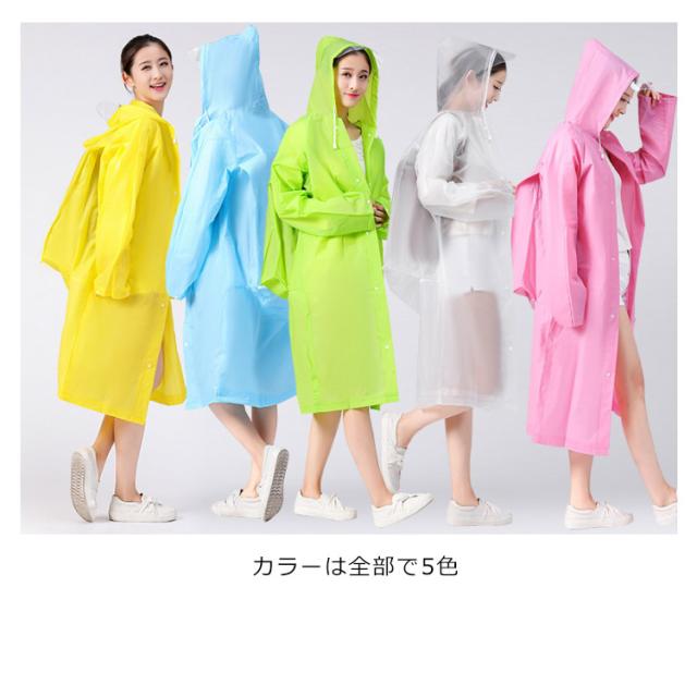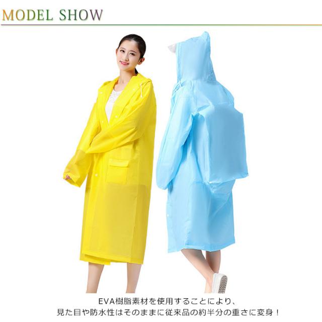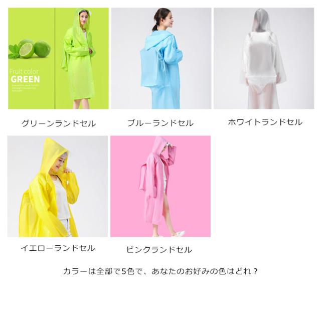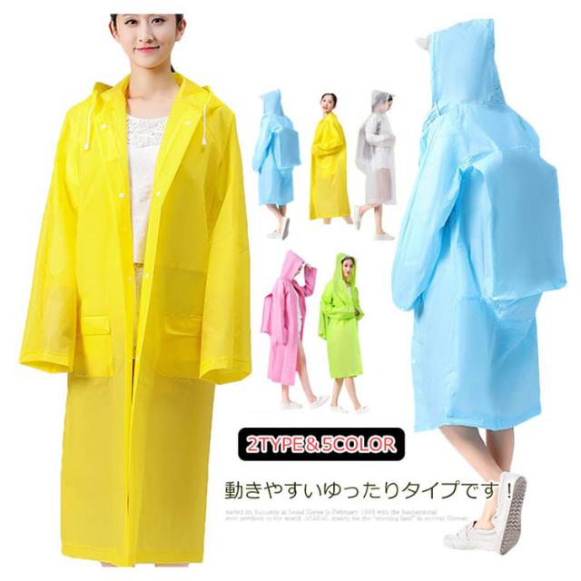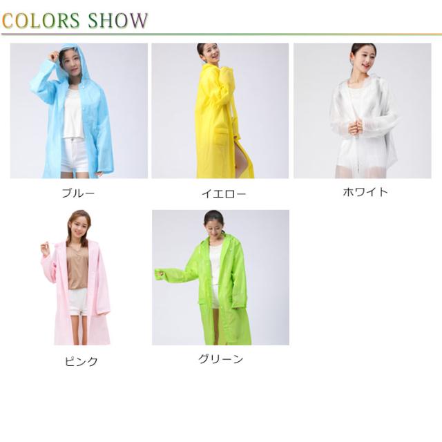 | 動きやすいゆったりタイプです! 半透明でお洒落なレインコートです 雨の日はカラフルなレインコートで気分を上げましょう! EVA樹脂素材を使用することにより、見た目や防水性はそのままに従来品の約半分の重さに変身! とても弾力性と柔軟性に優れています。低温下でも硬くなりにくい寒い場所でも柔軟性を保ちます。 カラーは全部で5色で、あなたのお好みの色はどれ? | |