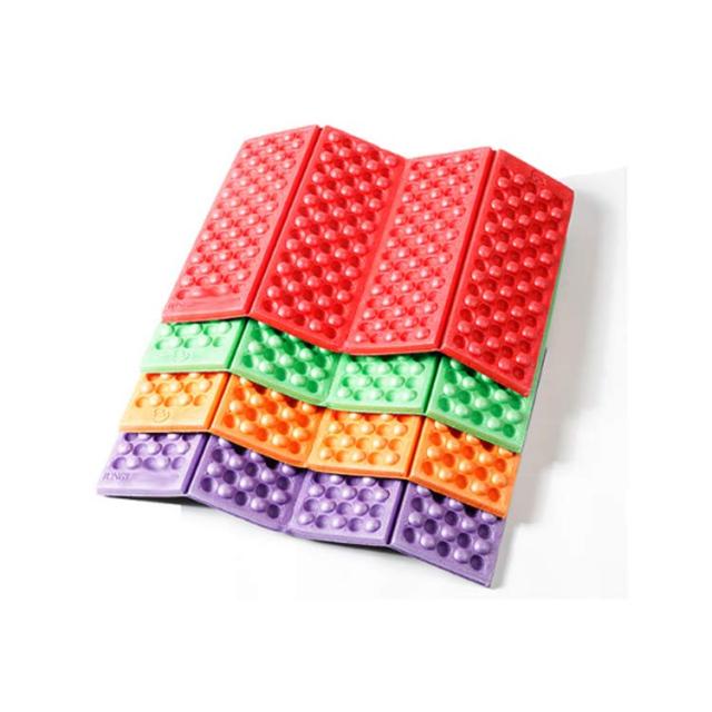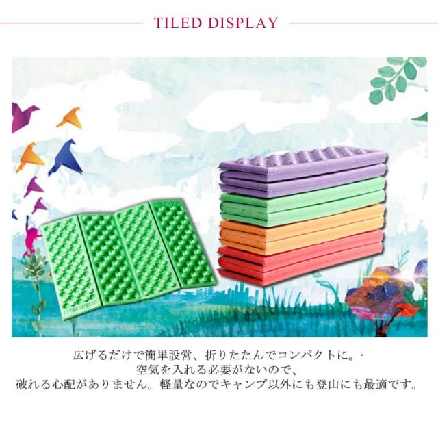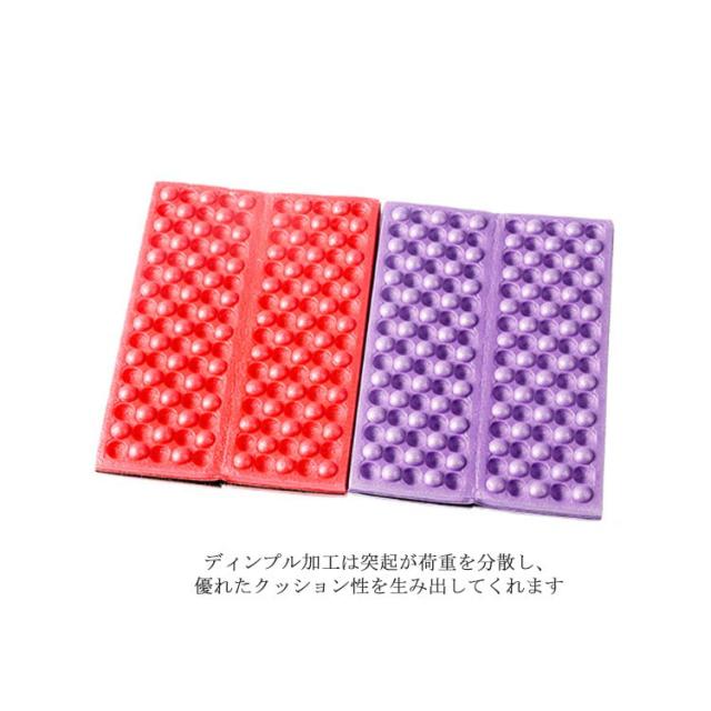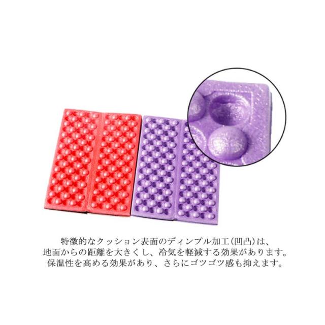 | 折りたたみレジャーマット 広げるだけで簡単設営、折りたたんでコンパクトに。?空気を入れる必要がないので、破れる心配がありません。軽量なのでキャンプ以外にも登山にも最適です。 保温性を高め、冷気をシャットアウト! 特徴的なクッション表面のディンプル加工(凹凸)は、地面からの距離を大きくし、冷気を軽減する効果があります。保温性を高める効果があり、さらにゴツゴツ感も抑えます。 ディンプル加工は突起が荷重を分散し、優れたクッション性を生み出してくれます。 | |