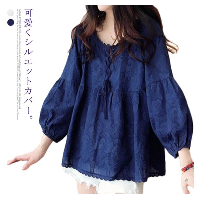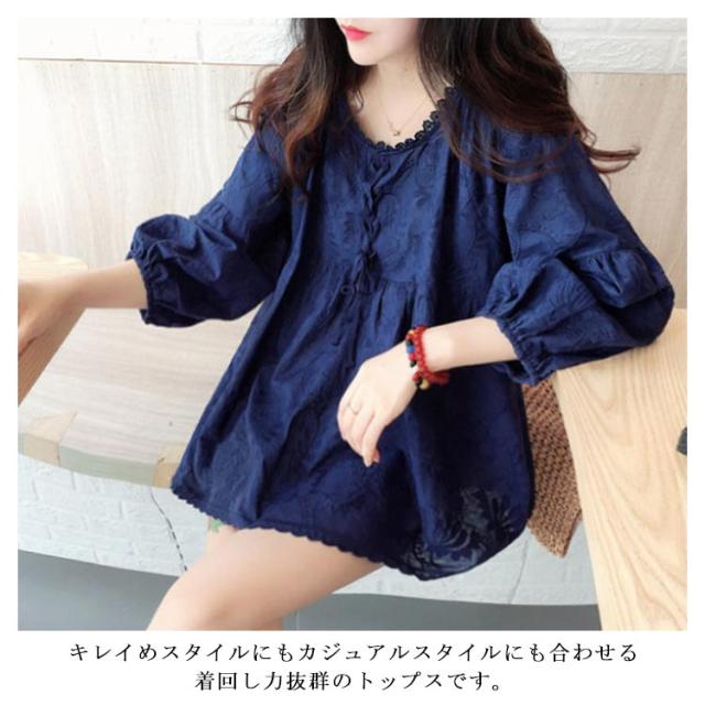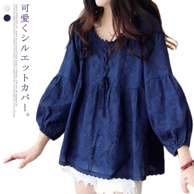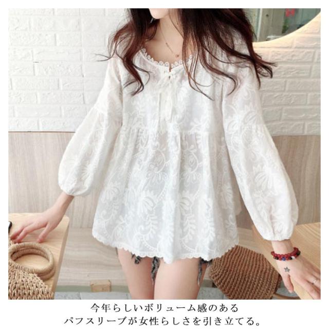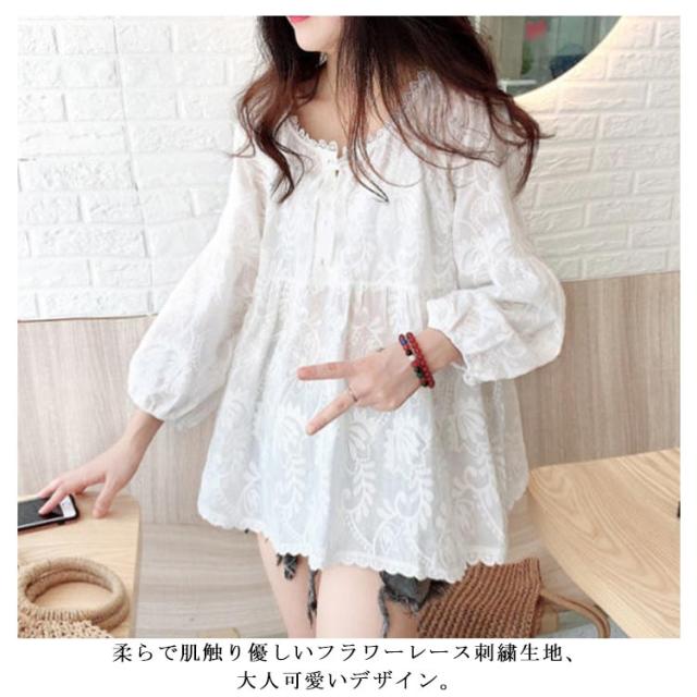 送料無料 レース刺繍 ブラウス プルオーバー レディース トップス 8分袖 フレア Aライン 透け感 可愛い バルーンスリーブ チュニック ギャザー スカラップ クルーネック 大きいサイズ