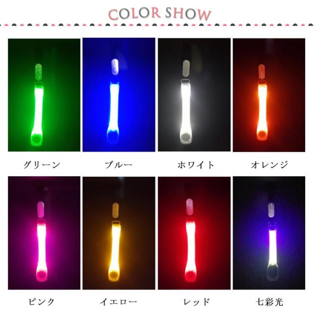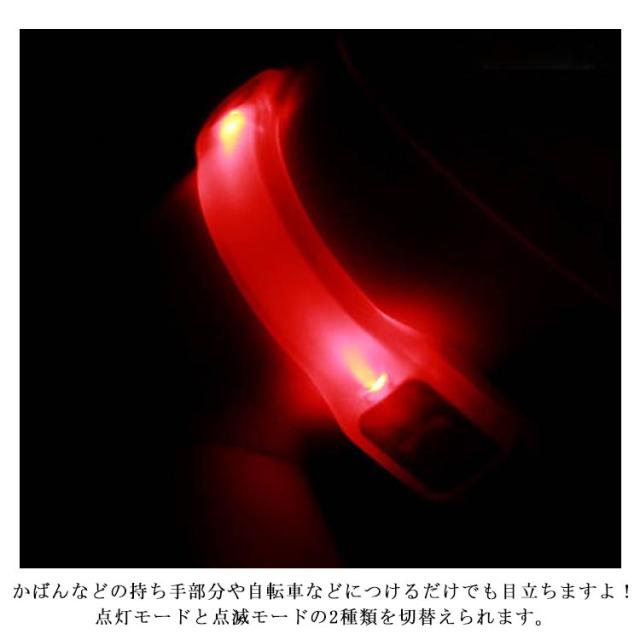 | 夜・朝方の散歩やジョギング、自転車走行、路上作業、交通整備などに! 明るく光るライトが車やバイクなどに位置を知らせ、注意を促します。 防犯や、交通事故などの防止に! フリーサイズなので大人から子どもまで使えます。 マジックベルトでカンタンに留めるだけ。 ベルト部分は伸びるので、脚や腕などにも付けられます。 かばんなどの持ち手部分や自転車などにつけるだけでも目立ちますよ! 点灯モードと点滅モードの2種類を切替えられます。 連続点灯時間は約70時間、連続点滅時間は約90時間と小さいながらもパワフル! 危険意識を高める高輝度LEDライト搭載! | |