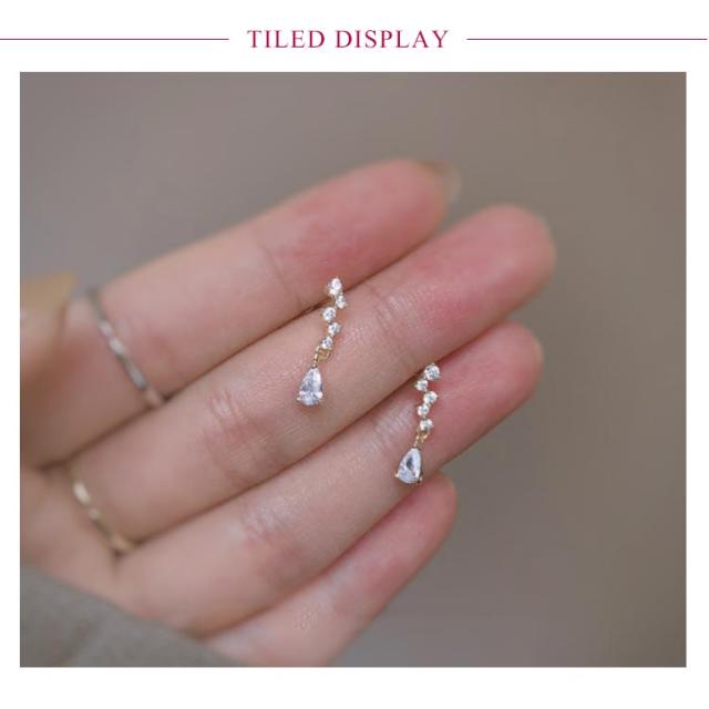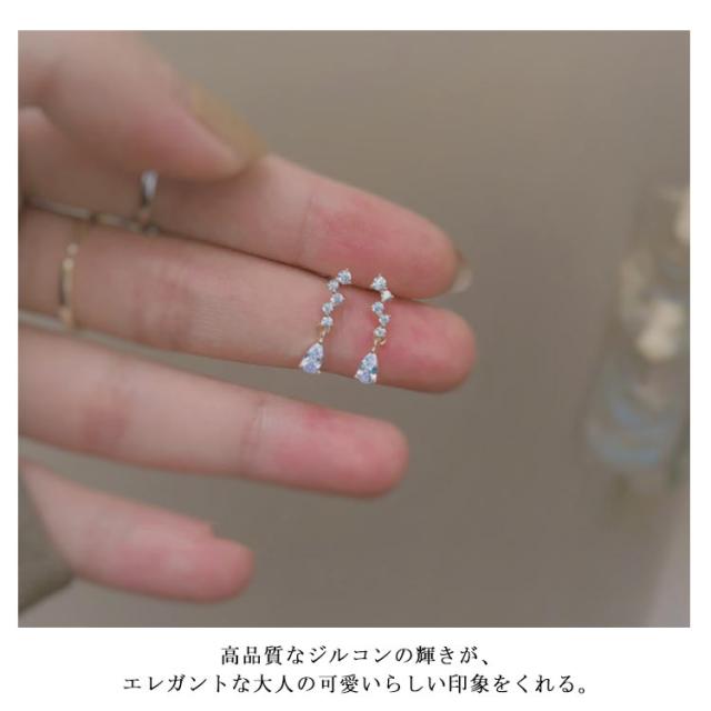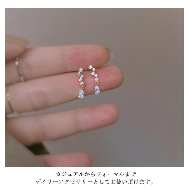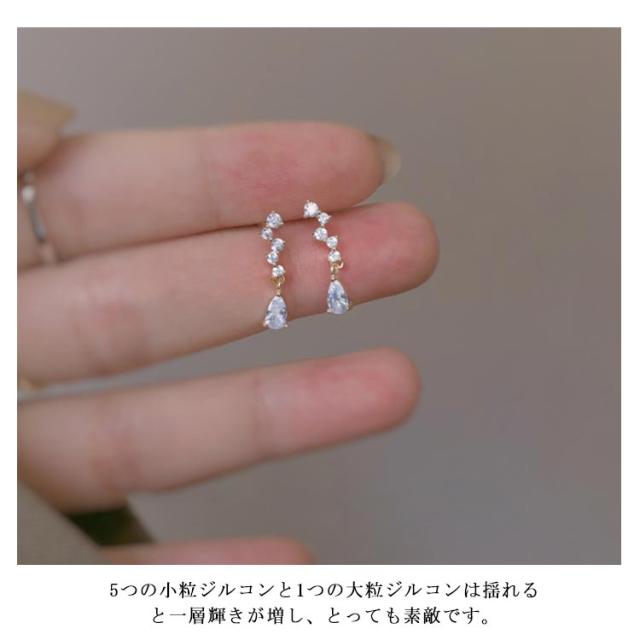 | 揺れるときらきらと輝く上品で華やかなロングイヤリングです。 高品質なジルコンの輝きが、エレガントな大人の可愛いらしい印象をくれる。 水滴のようなデザインは繊細で華奢な女性らしい耳元を演出します。 カジュアルからフォーマルまでデイリーアクセサリーとしてお使い頂けます。 5つの小粒ジルコンと1つの大粒ジルコンは揺れると一層輝きが増し、とっても素敵です。 | |