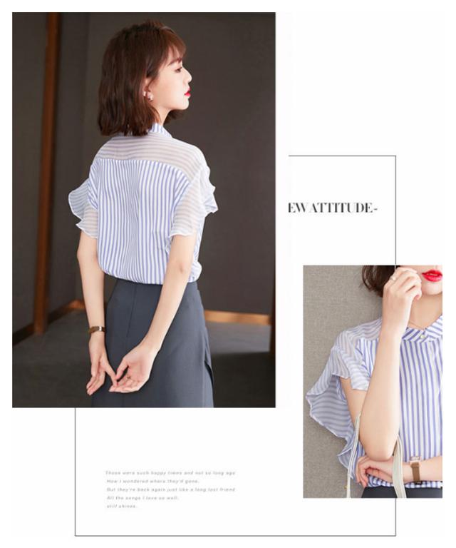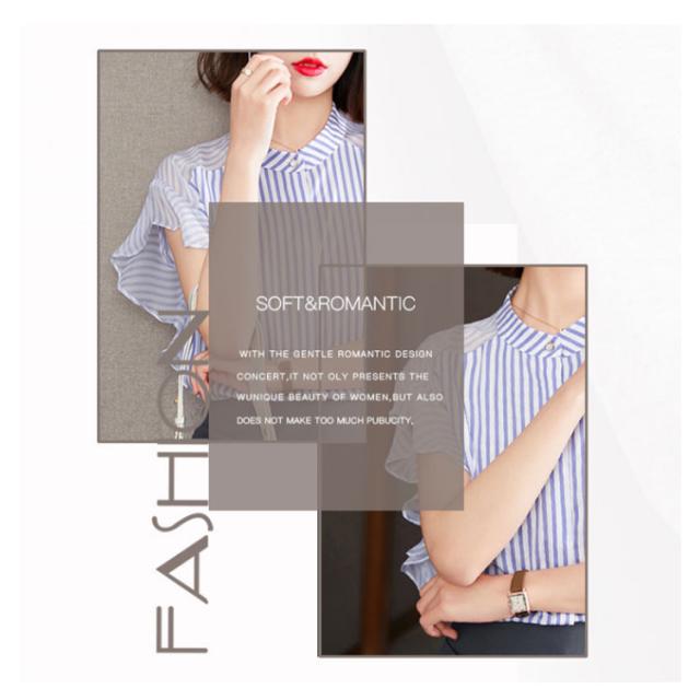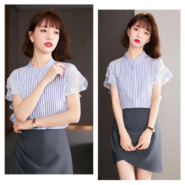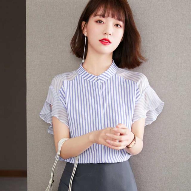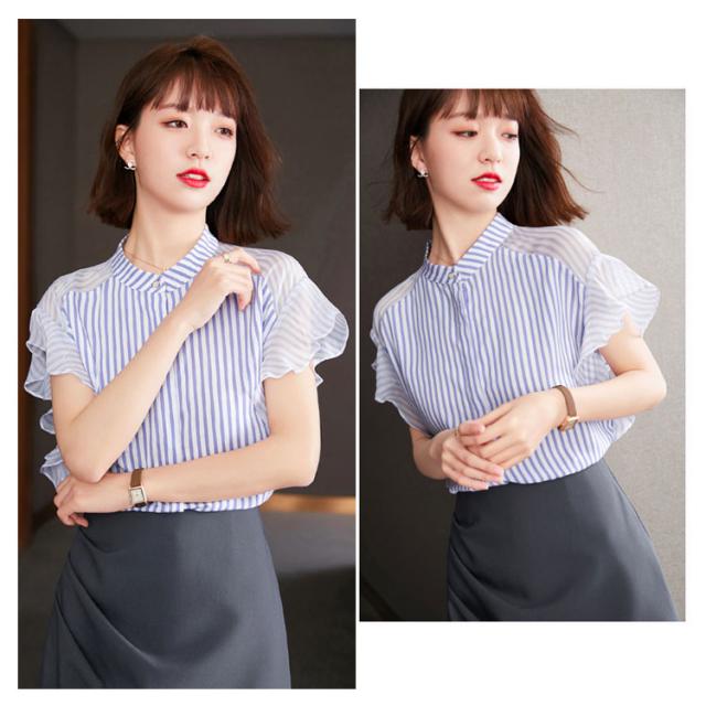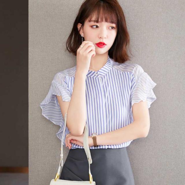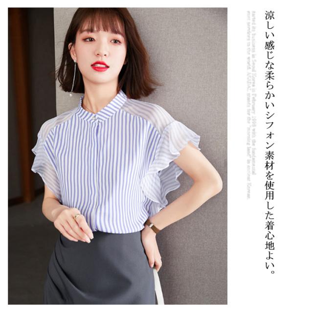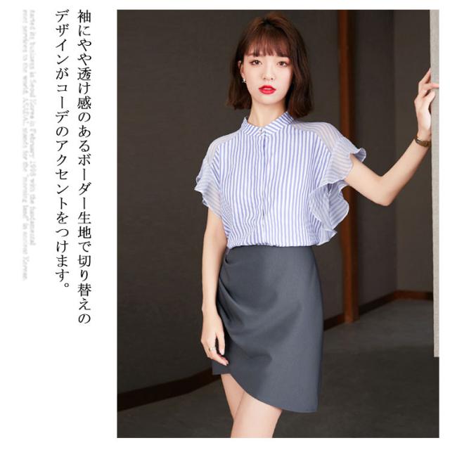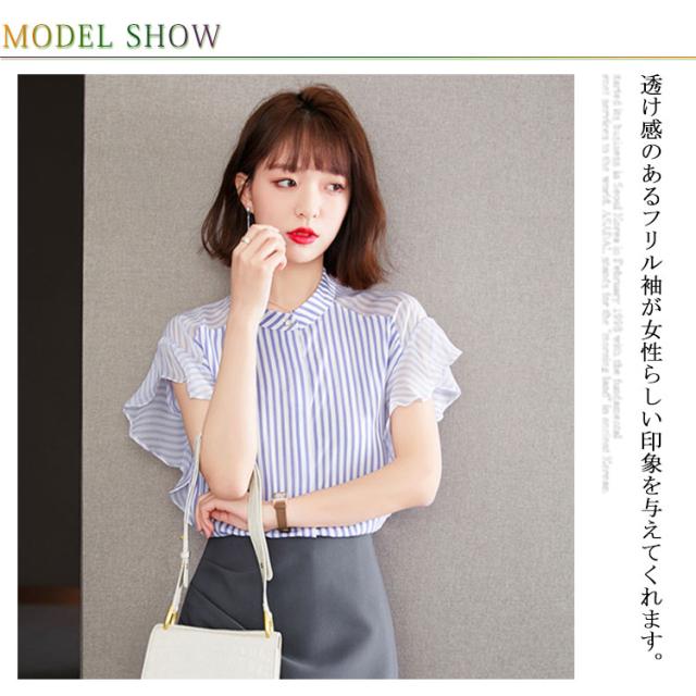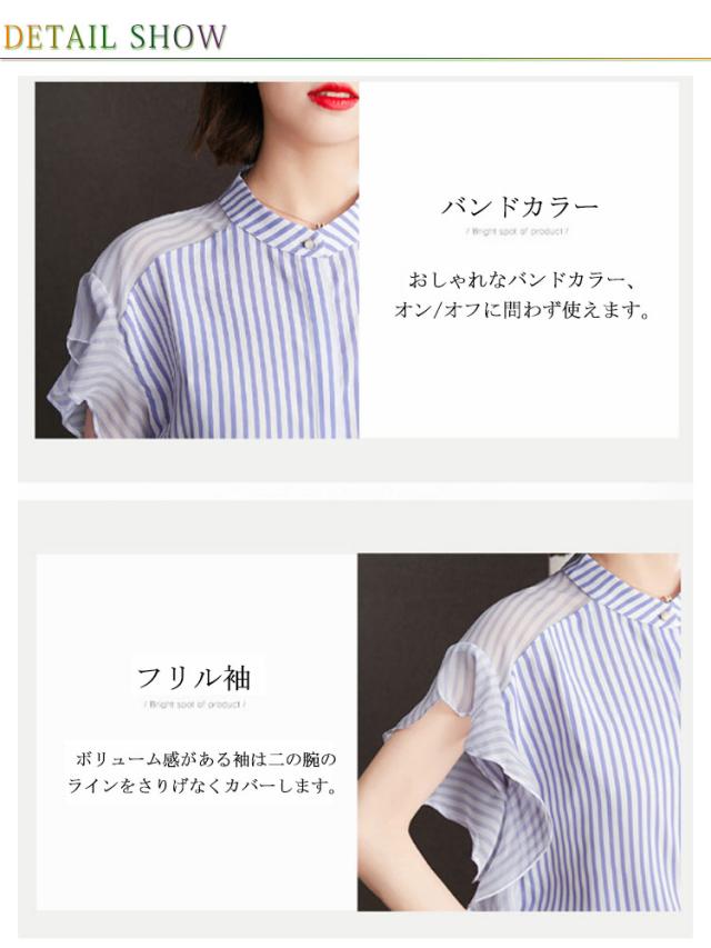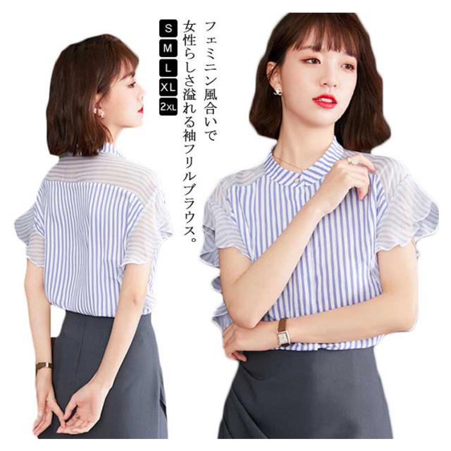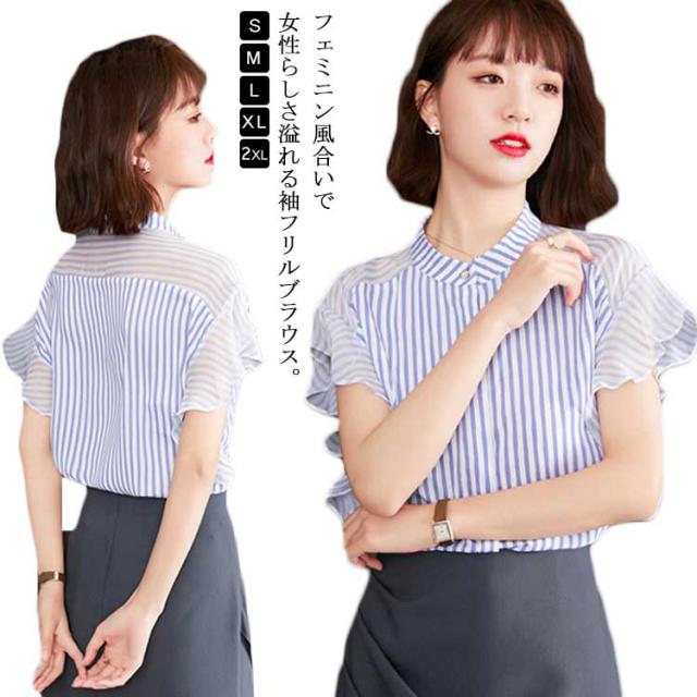 ブラウス トップス レディース 夏 きれいめ 送料無料 切り替え 透け感 細見え スリム 前ボタン バンドカラー 上品 ボーダー ラッフルスリーブ フリル袖 半袖 二の腕カバー 上品 ふんわり 大きいサイズ 大人 可愛い 服