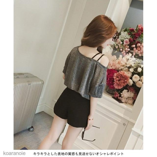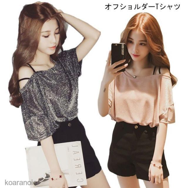 Tシャツ オフショルダー レディース カットソー 五分丈袖 ブラウス キラキラ ゆったり 女性用 トップス 肩出し 半袖Tシャツ 夏物 キュート