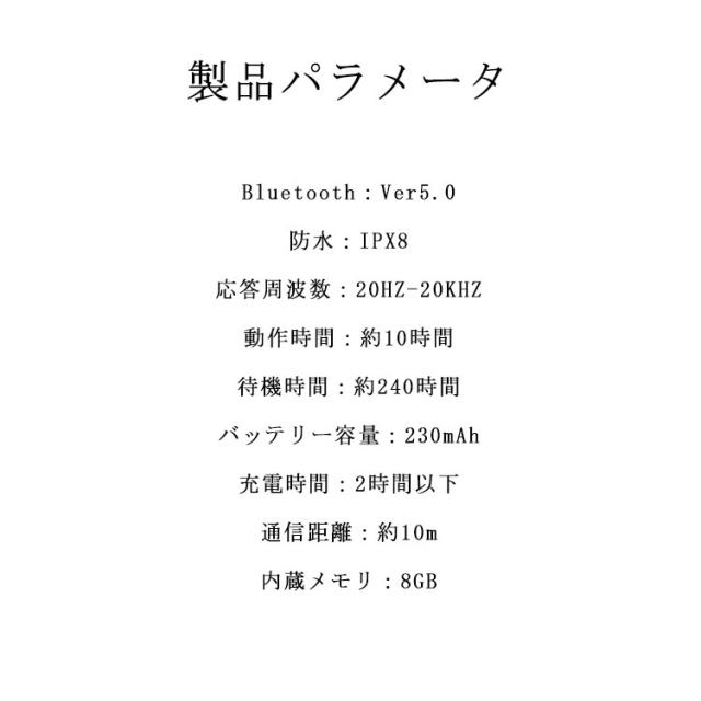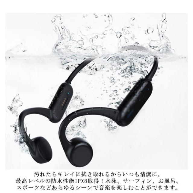 | 泳ぎながら聴く 完全防水骨伝導ワイヤレスイヤホン。 最高レベルの防水性能IPX8取得!水泳、サーフィン、お風呂、スポーツなどあらゆるシーンで音楽を楽しむことができます。 8GBメモリー内蔵で、スマホやタブレットに接続して、音楽など楽しむことはもちろん、デバイスなくても内部メモリにて音楽が楽しんでいただけます。 従来より省エネ、低遅延、安定の接続を実現するbluetooth5.0を採用し、ゲームやドラマ鑑賞する時より快適。 フック式と落下防止ストラップデザインなので、落ちにくいから、アウトドアやスポーツなどに最適。 音漏れなくリアルな骨伝導イヤホン!耳の近くから内耳に微細な振動を伝える骨伝導仕様で、イヤホンを耳道に入らず、高音の刺激から聴力を保護。 通話や音楽を聞きながら、周囲の音を聞き取れるから安全運転をしっかりサポート イヤホンには柔らかい素材を採用し、長時間装着しても痛くない。 汚れたらキレイに拭き取れるからいつも清潔に。 | |