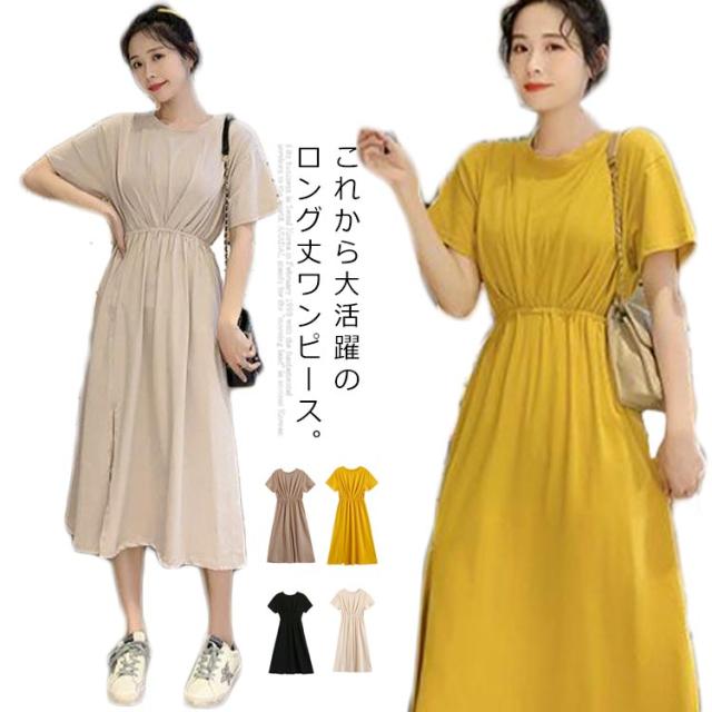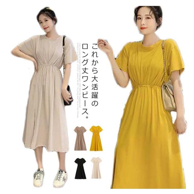 ロング丈ワンピース レディース 半袖 マキシ丈ワンピース ルームウェア 部屋着 体型カバー 送料無料 ウエストゴム コットン 着痩せ おしゃれ 旅行 春夏