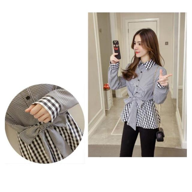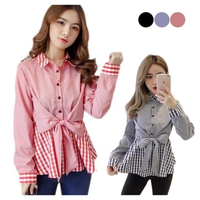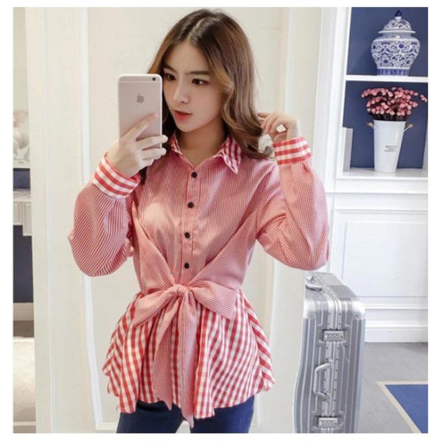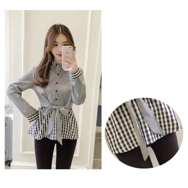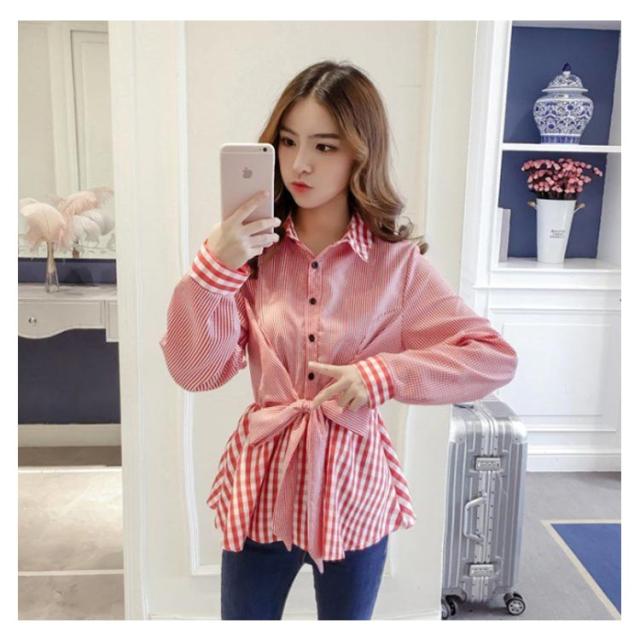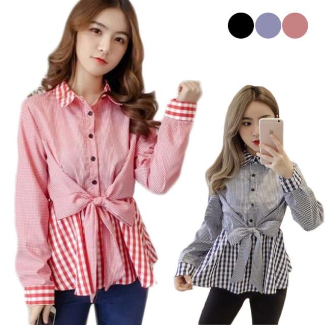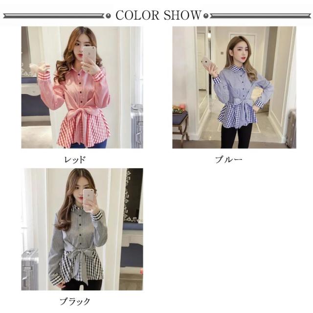 レディース ブラウス フリル 春 チェック柄 リボン付き トップス ストライプ シャツ 女性 韓国 長袖 前開け 異素材 送料無料 シンプル フェミニン 着痩せ カジュアル おしゃれ