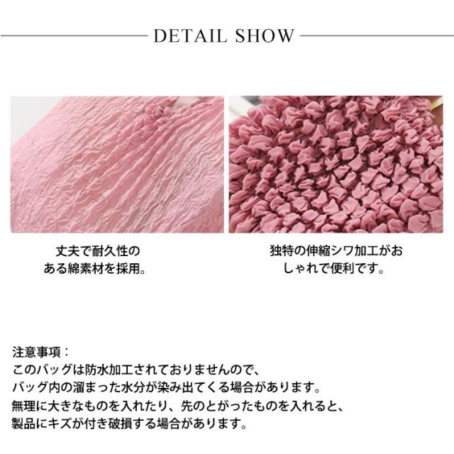 | 全10色!実用性とファション感兼備なシワ加工エコバッグ。 丈夫で耐久性のある綿素材を採用。 独特の伸縮シワ加工がおしゃれで便利です。 伸びやすく大容量です 軽くて持ちやすい ちょっとしたお出かけやショッピング等便利なアイテムです。 | |