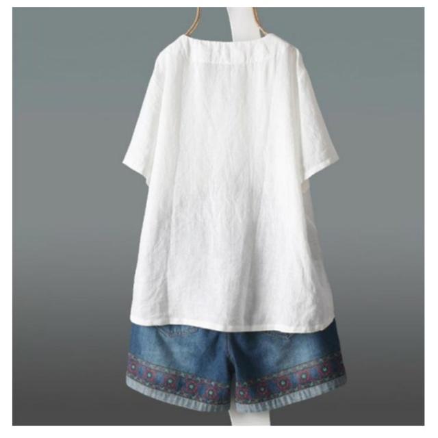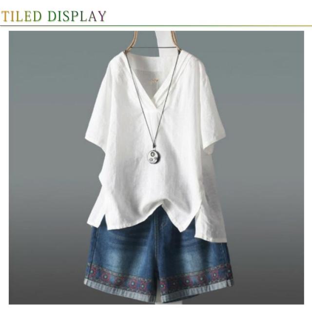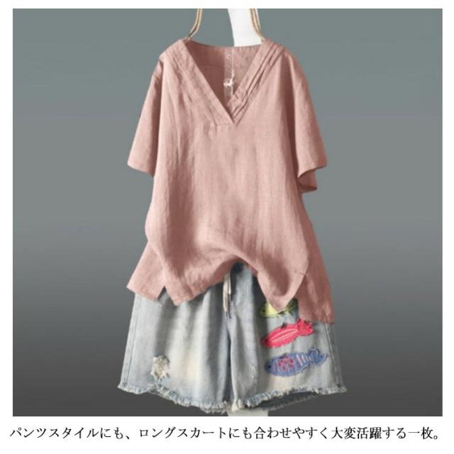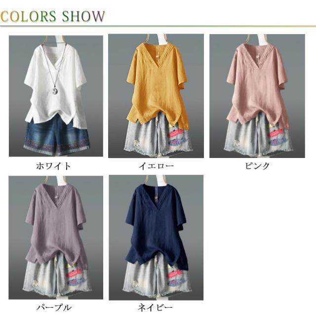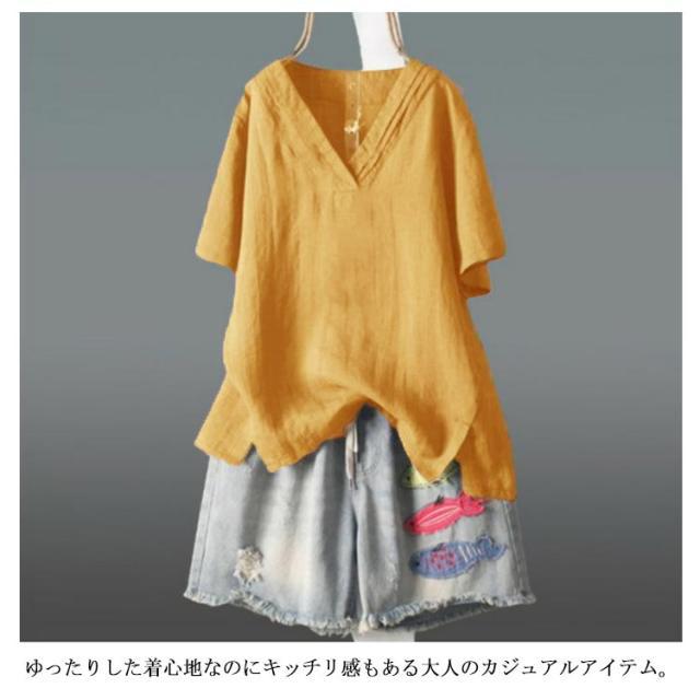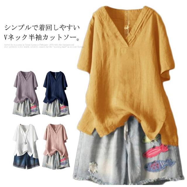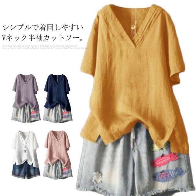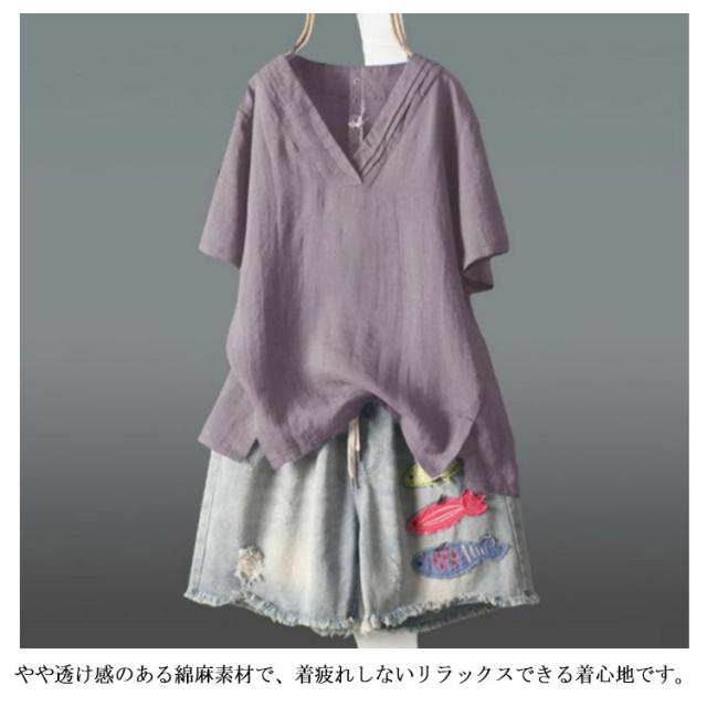 【送料無料】ブラウス カットソー 綿麻 半袖 レディース Vネック 透け感 シャツ トップス プルオーバー サイドスリット テールカット ゆったり 重ね着 プルオーバー 体型カバー 春夏 大人カジュアル 無地