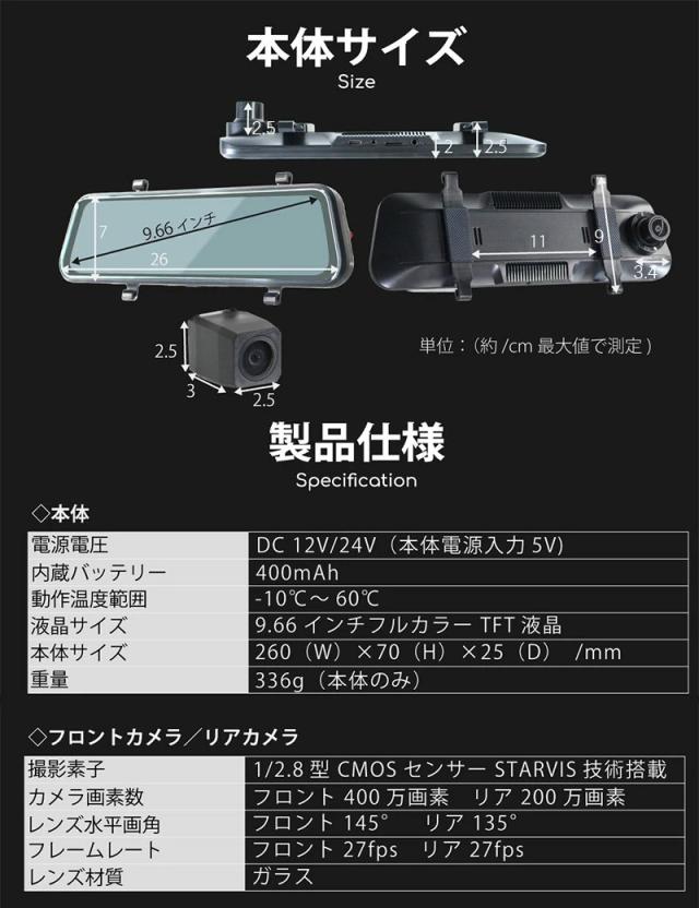 ドライブレコーダー ミラー型 ドラレコ 前後 バックカメラ 駐車監視 日本車 カメラ ミラー一体型 タッチパネル ルームミラー 12V 24V ミラー 高画質 9.66インチ後方