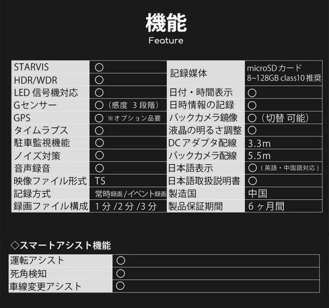Gセンサー、常時録画、サイクル録画、衝撃録画、駐車監視、タイムラプスなどに対応しています。