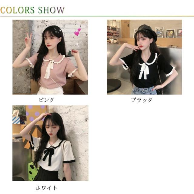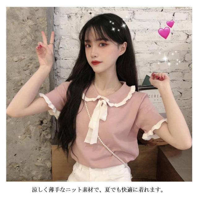 【送料無料】ニット トップス レディース サマーニット セーター 半袖 襟つき 丸襟 無地 リブ編み フリル リボン やわらかい 涼しい かわいい きれいめ 体型カバー 美ライン 春 夏